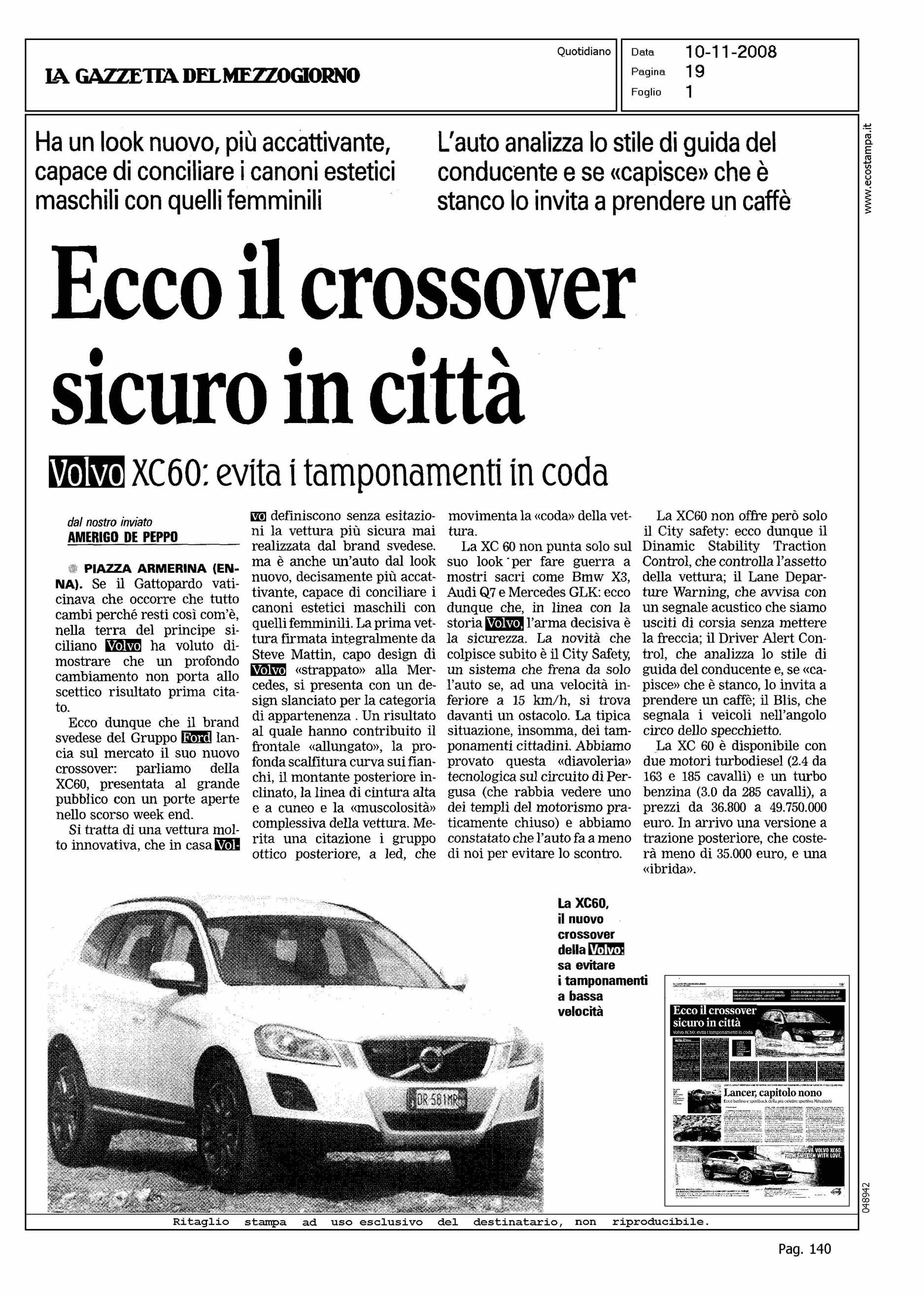 Author: DE PEPPO, AMERIGOLine: XC60 Model: Subject: ENNA TEST DRIVE Title: ECCO IL CROSSOVER SICURO IN CITTA'Highlight: