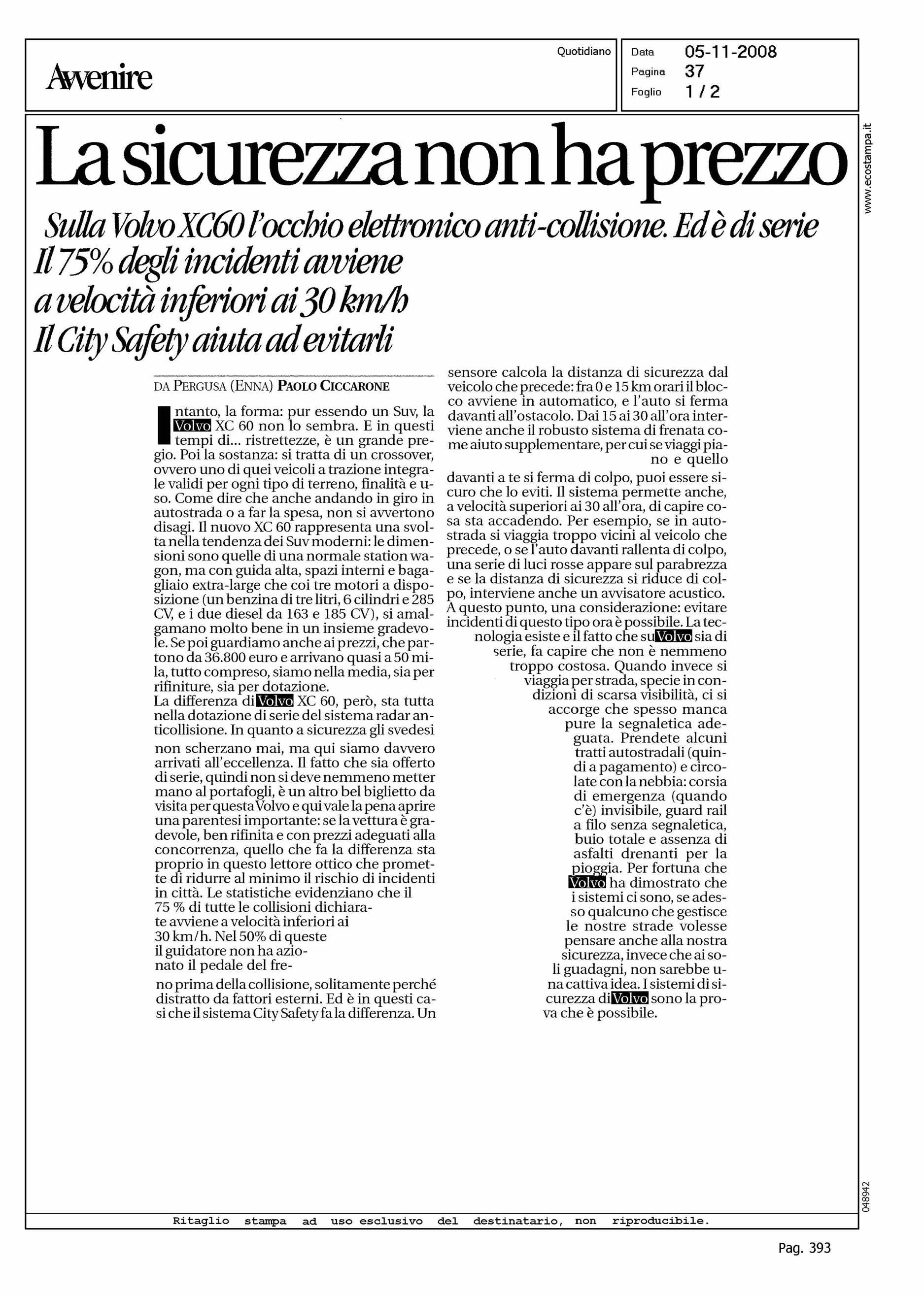 Author: CICCARONE, PAOLOLine: XC60 Model: Subject: ENNA TEST DRIVE Title: LA SICUREZZA NON HA PREZZOHighlight: