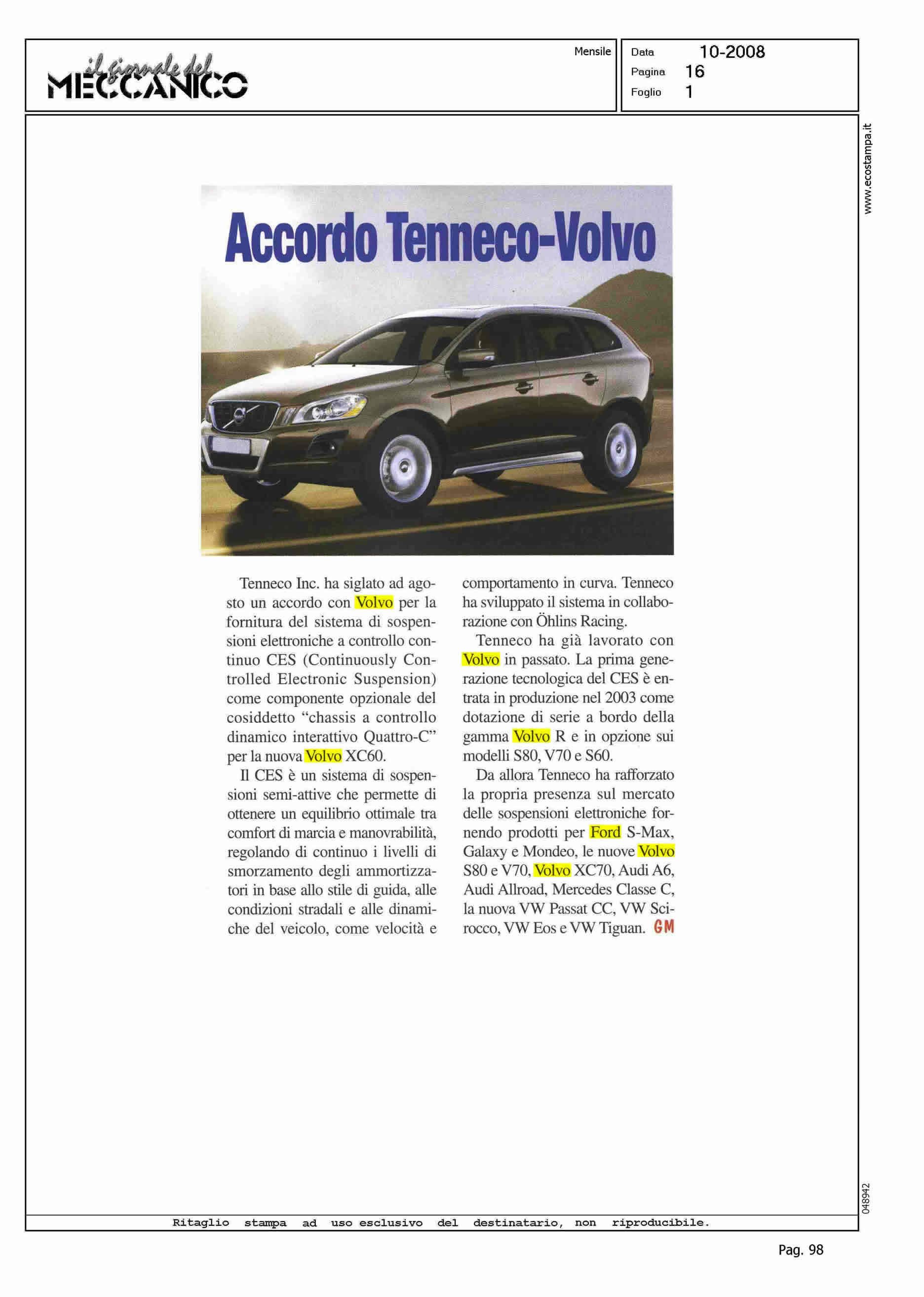 Author: Line: XC60 Model: Subject: NEWS Title: ACCORDO TENNECO - VOLVOHighlight: