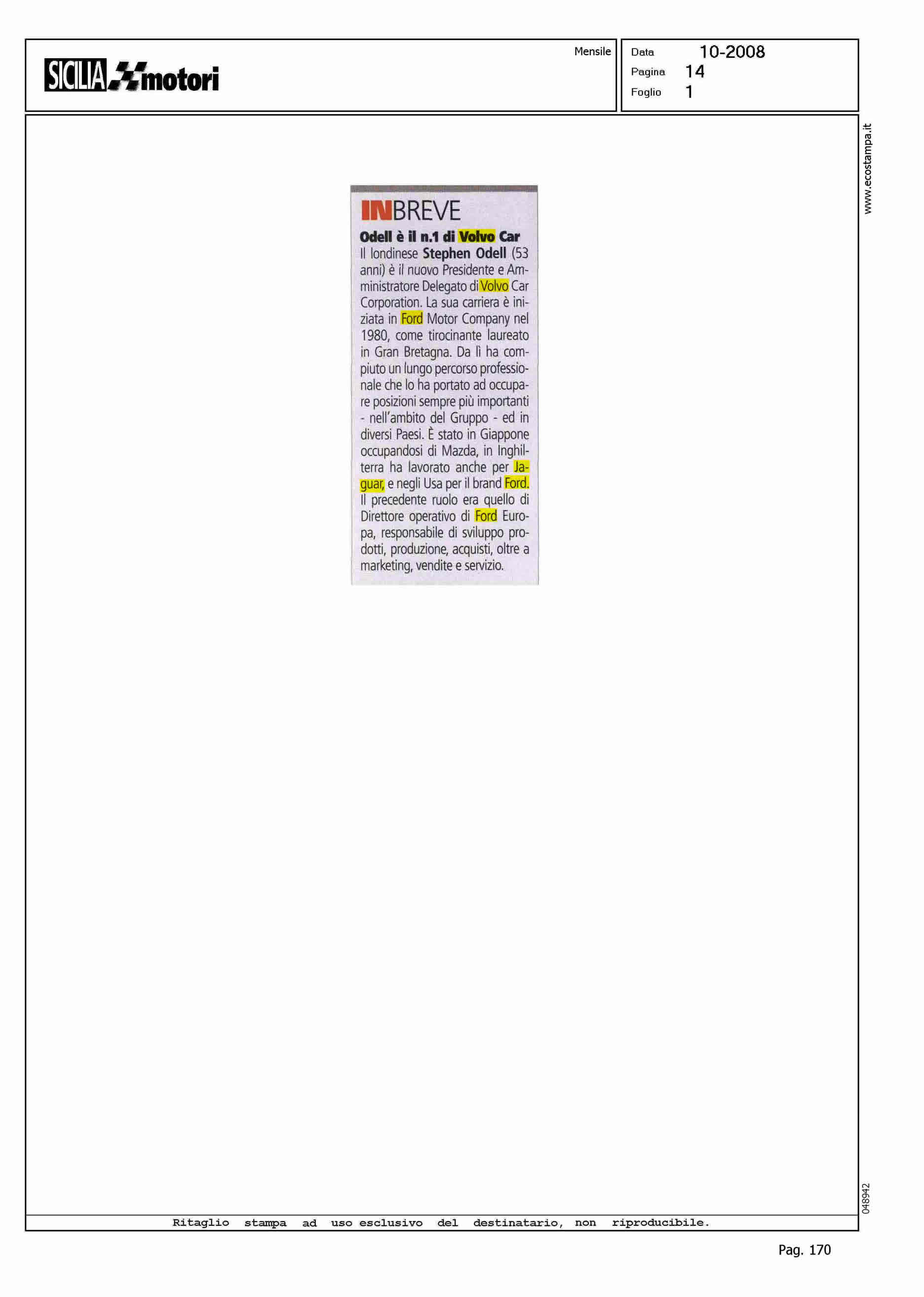 Author: Line: Corporate Model: Corporate Subject: NEWS Title: IN BREVE. ODELL E' IL N.1 DI VOLVO CARHighlight: