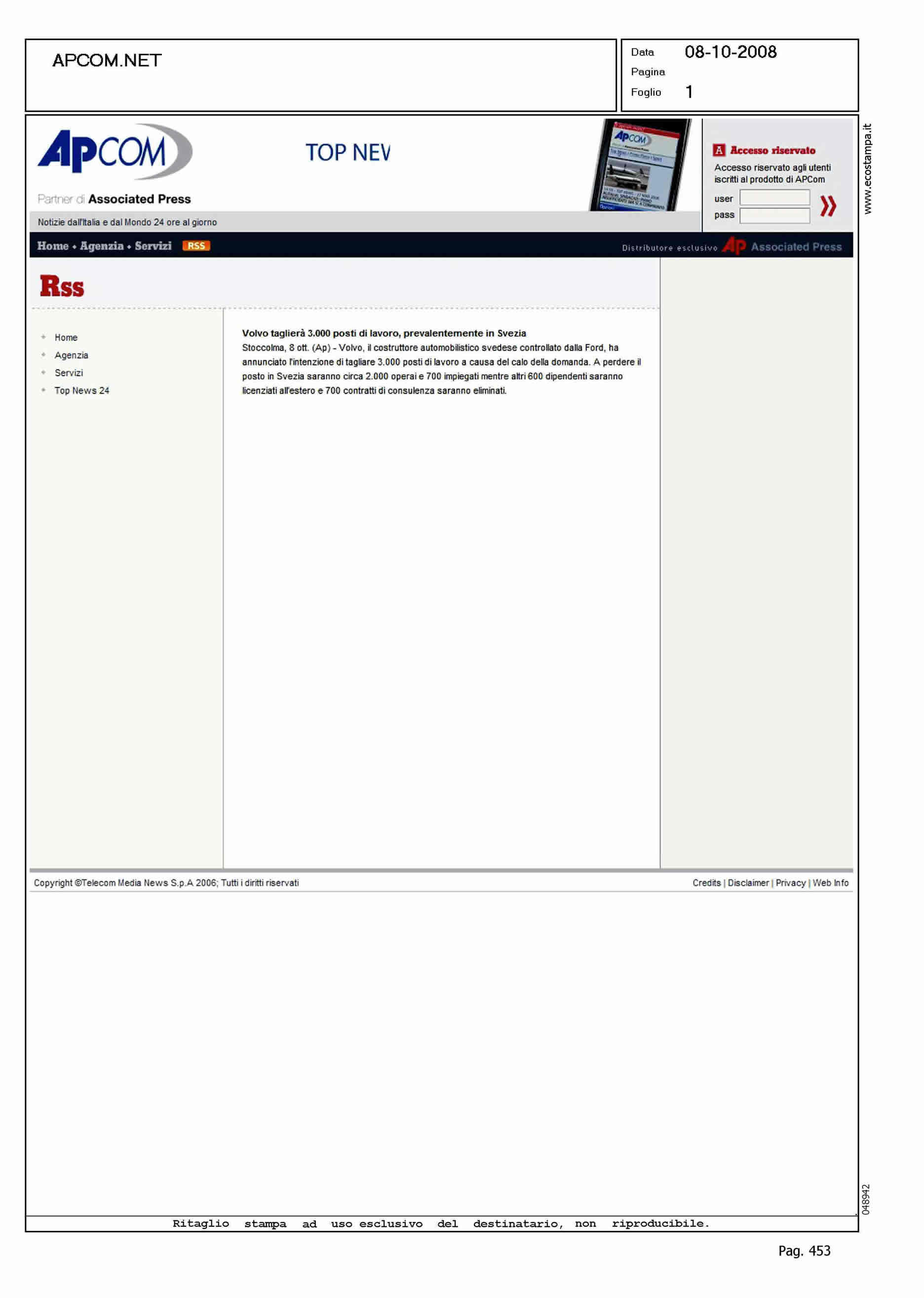 Author: Line: Corporate Model: Corporate Subject: NEWS Title: VOLVO TAGLIERA' 3.000 POSTI DI LAVORO, PREVALENTEMENTE IN SVEZIAHighlight: