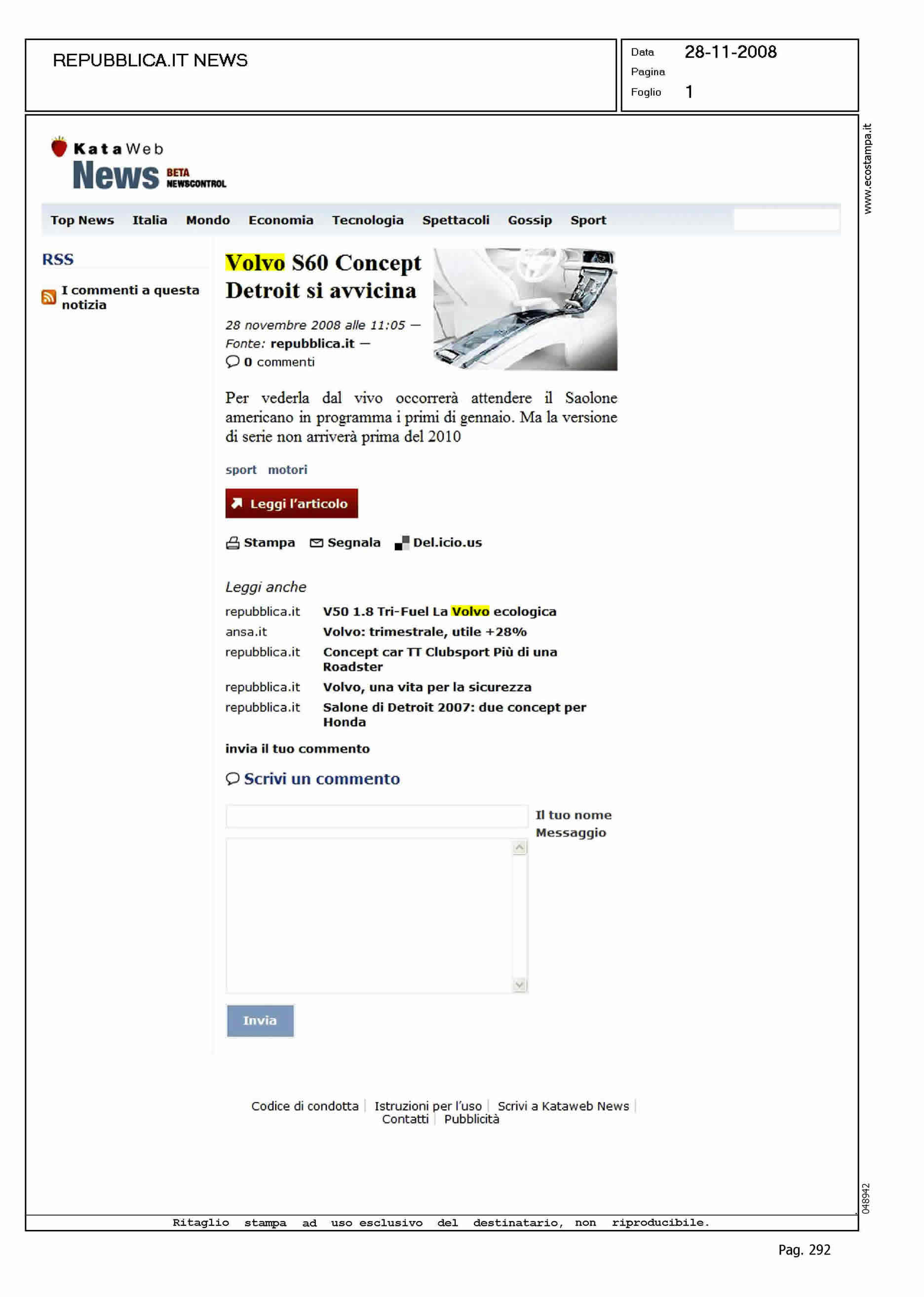 Author: Line: Corporate Model: Corporate Subject: NEWS Title: VOLVO S60 CONCEPT DETROIT SI AVVICINAHighlight: