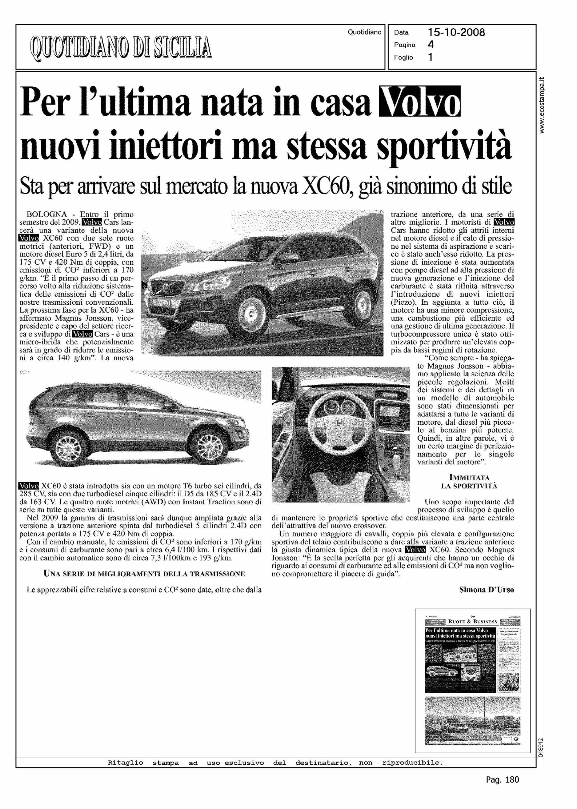 Author: D'URSO, SIMONALine: XC60 Model: Subject: PRODUCT PRESENTATION Title: PER L'ULTIMA NATA IN CASA VOLVO NUOVI INIETTORI MA STESSA SPORTIVITA'Highlight: