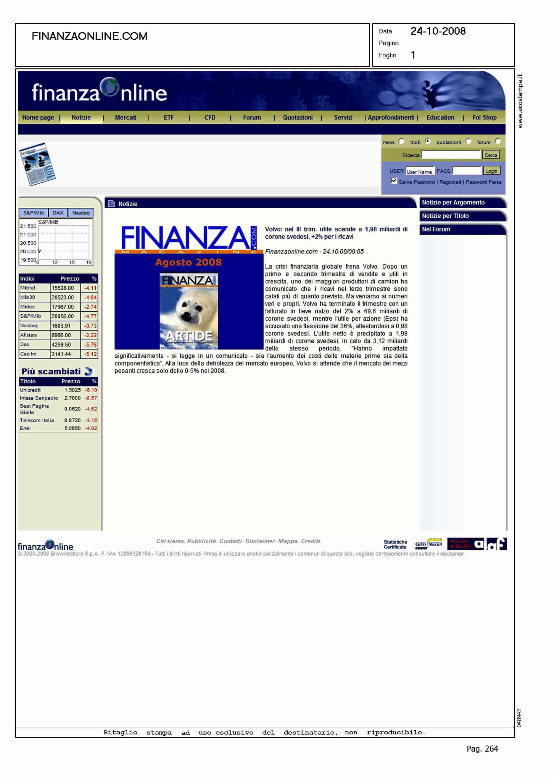 Author: Line: Corporate Model: Corporate Subject: NEWS Title: VOLVO: NEL III TRIM. UTILE SCENDE A...Highlight: