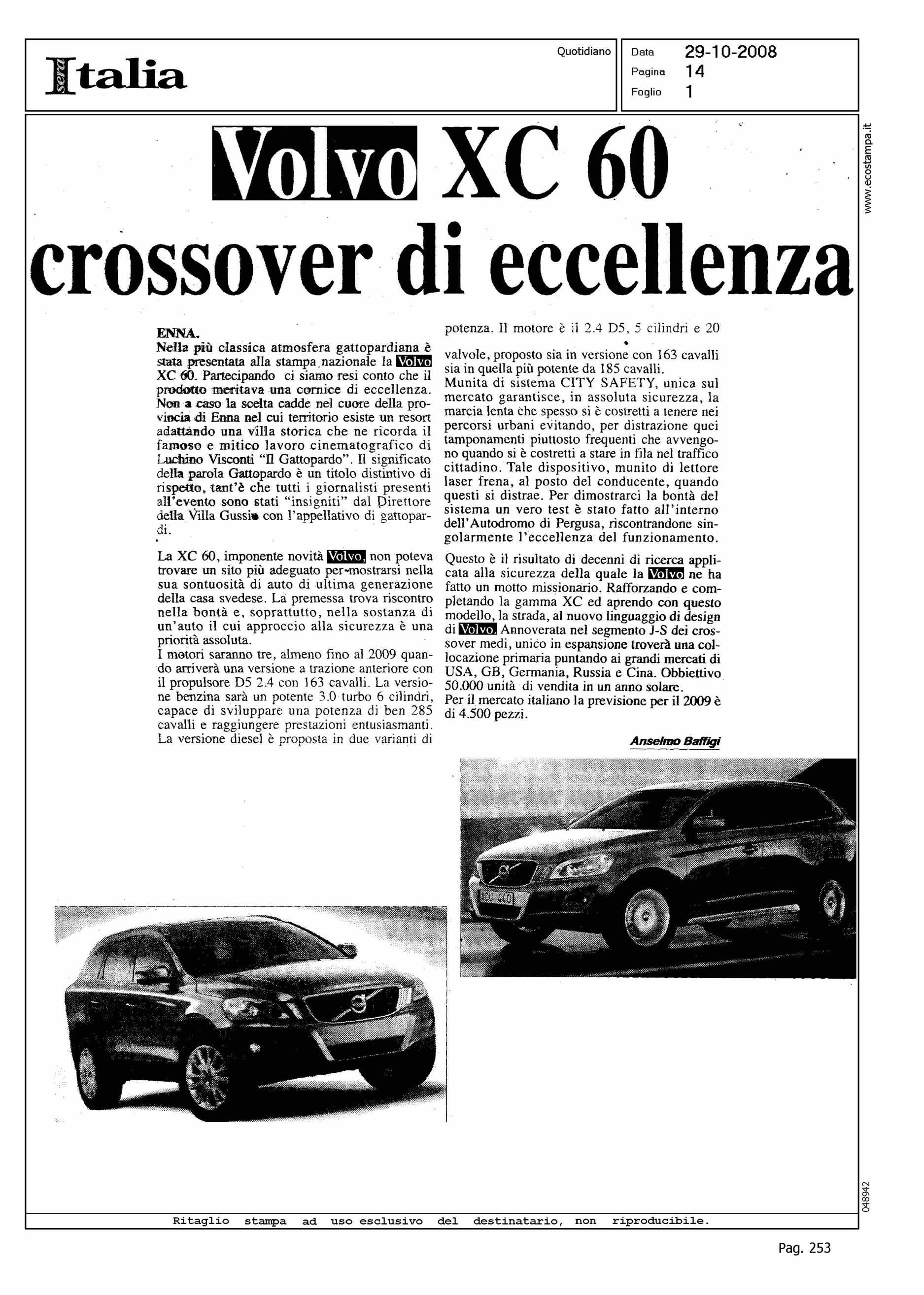 Author: BAFFIGI, ANSELMOLine: XC60 Model: Subject: PRODUCT PRESENTATION Title: VOLVO XC60 CROSSOVER DI ECCELLENZAHighlight: