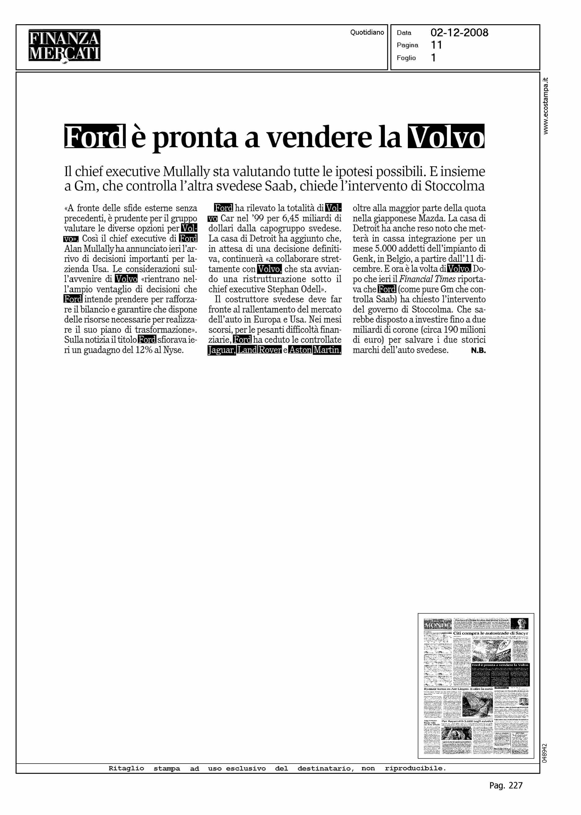 Author: Line: Corporate Model: Corporate Subject: NEWS Title: FORD E' PRONTA A VENDERE LA VOLVOHighlight: