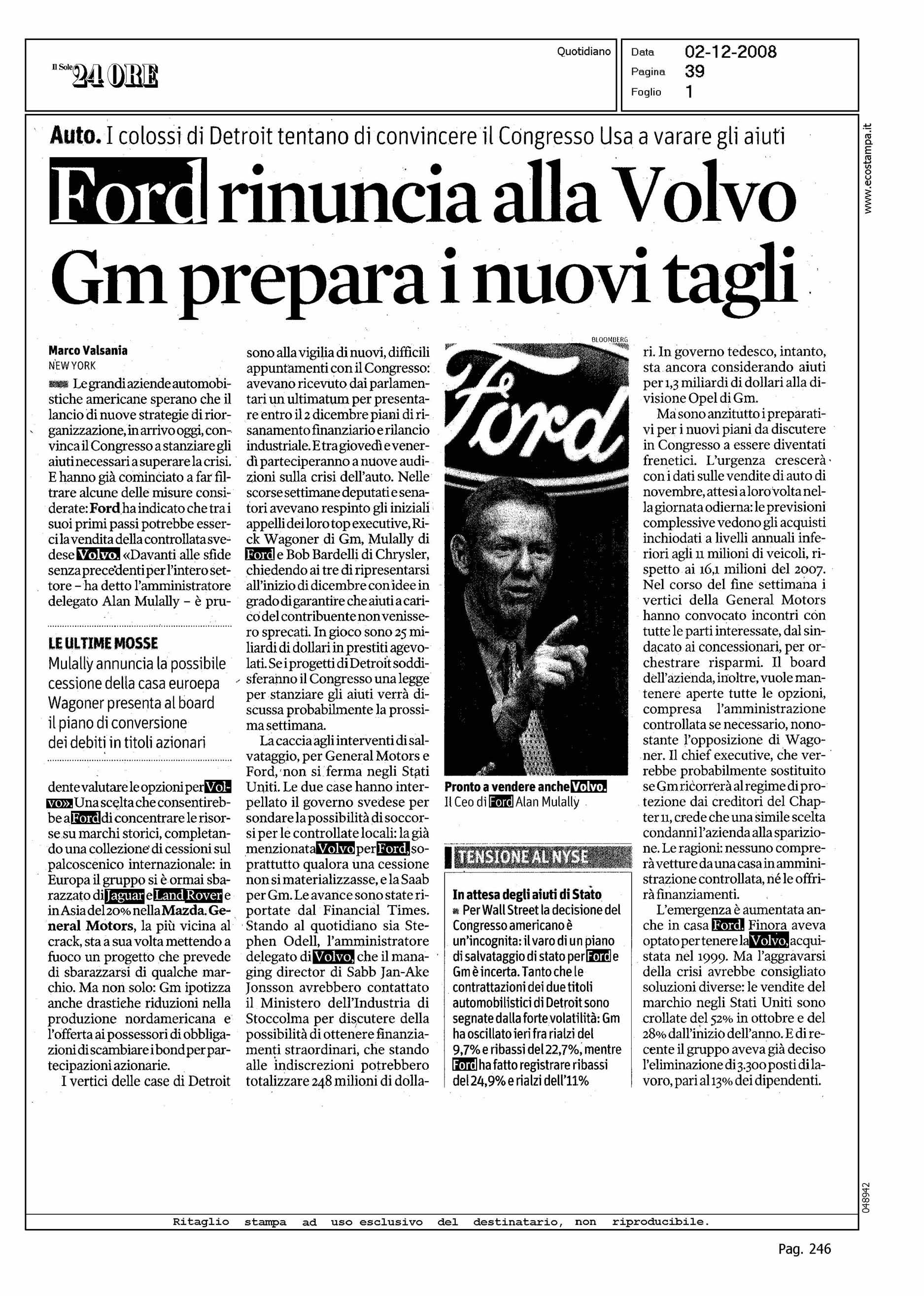 Author: VALSANIA, MARCOLine: Corporate Model: Corporate Subject: NEWS Title: FORD RINUNCIA ALLA VOLVOHighlight:
