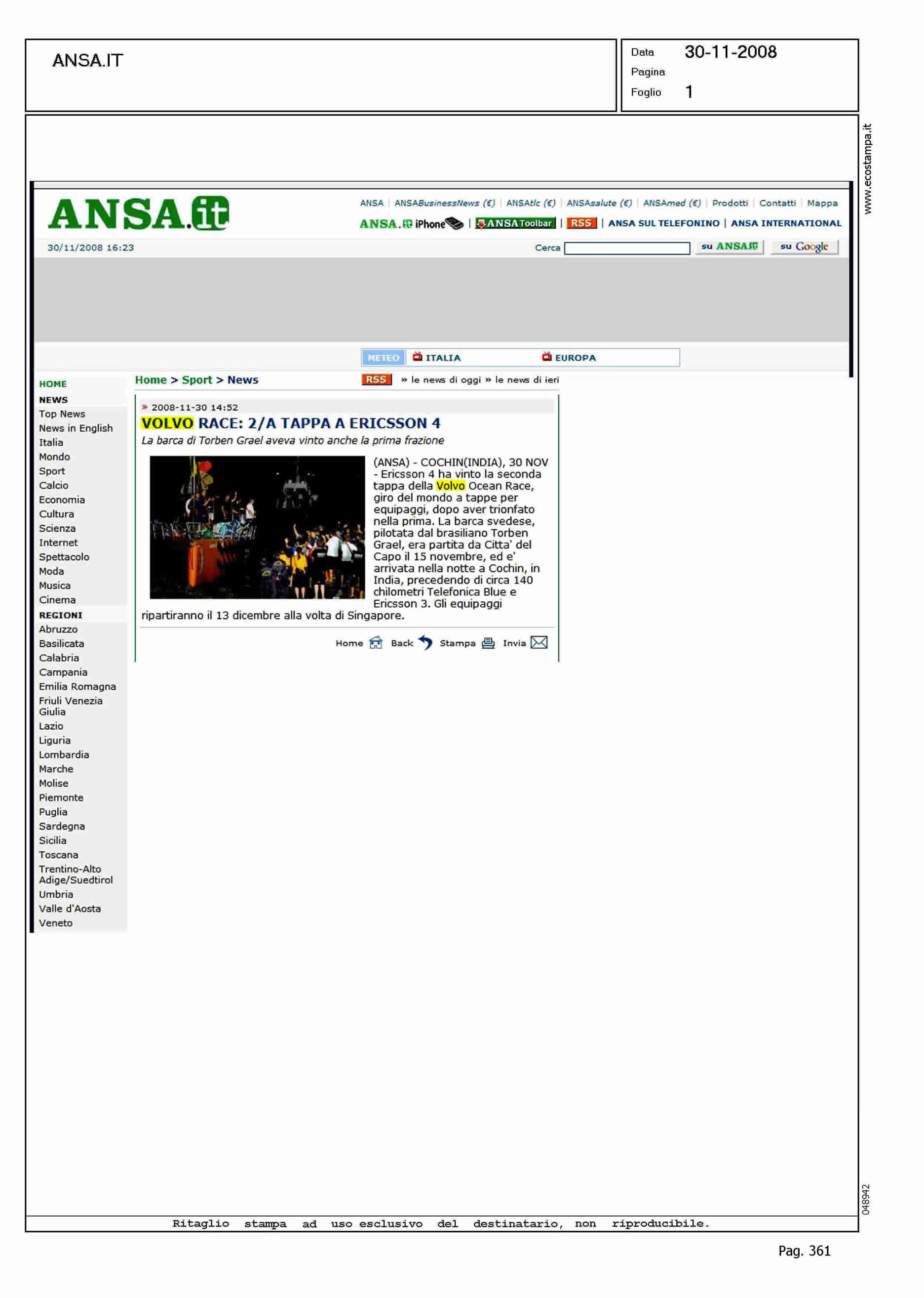 Author: Line: Corporate Model: Corporate Subject: VOLVO OCEAN RACE Title: VOLVO RACE: 2/A TAPPA A ERICSSON 4Highlight: