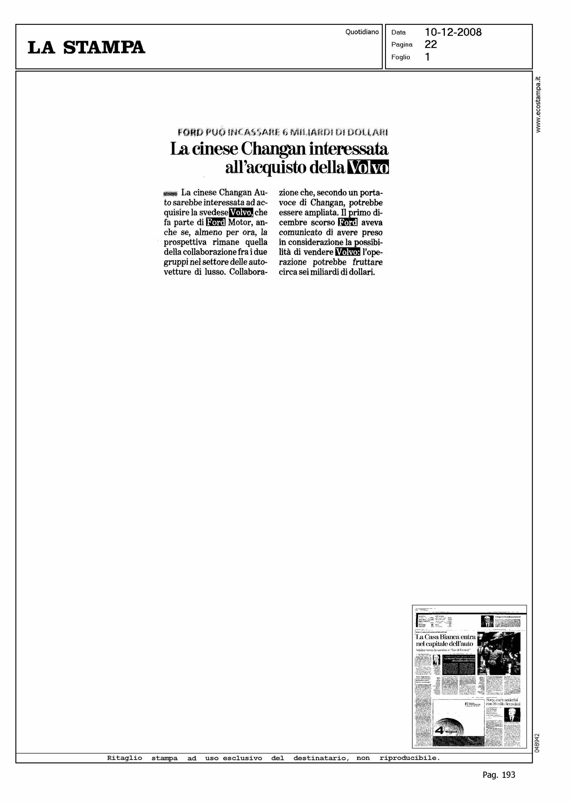 Author: Line: Corporate Model: Corporate Subject: NEWS Title: LA CINESE CHANGAN INTERESSATA ALL'ACQUISTO DELLA VOLVOHighlight: