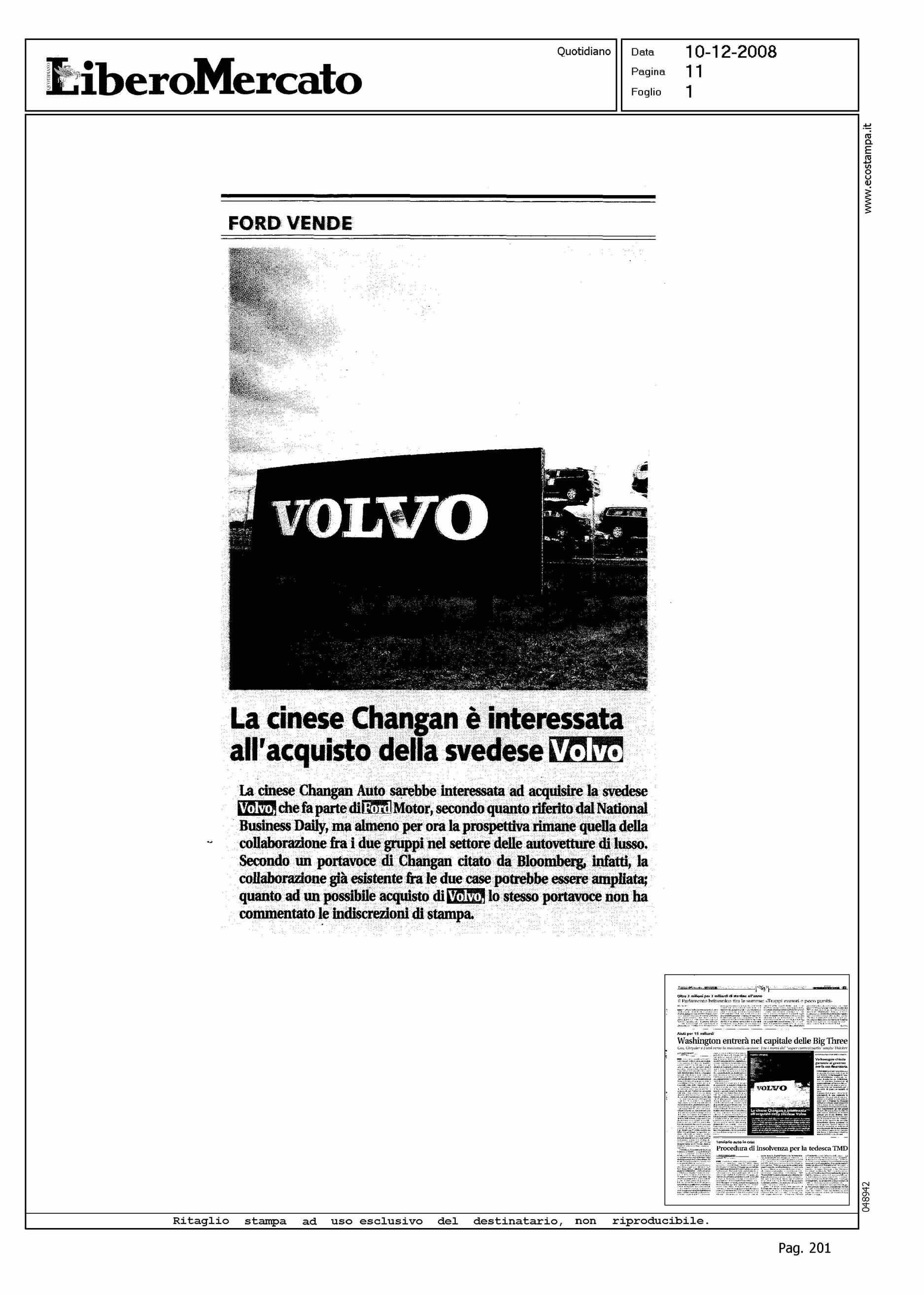 Author: Line: Corporate Model: Corporate Subject: NEWS Title: LA CINESE CHANGAN E' INTERESSATA ALL'ACQUISTO DELLA SVEDESE VOLVOHighlight: