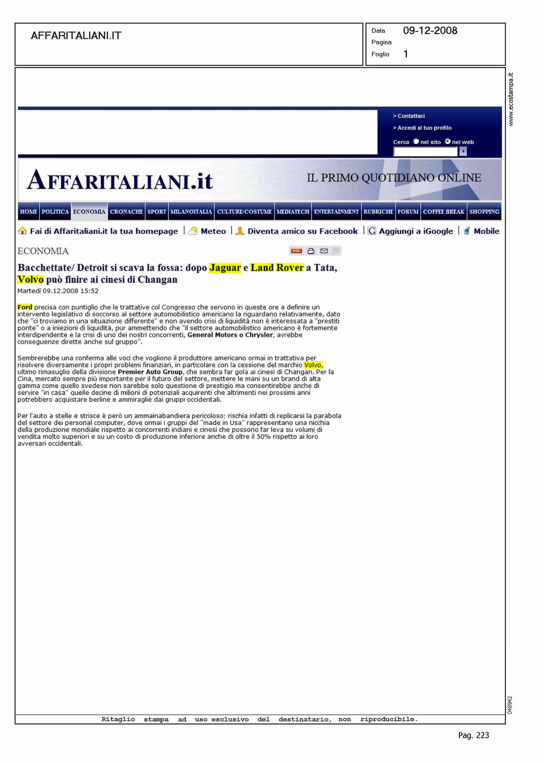 Title: BACCHETTATE/DETROIT SI SCAVA LA FOSSA: DOPO JAGUAR E LAND ROVER A TATA, VOLVO PUO' FINIRE AI CINESI DI CHANGAN