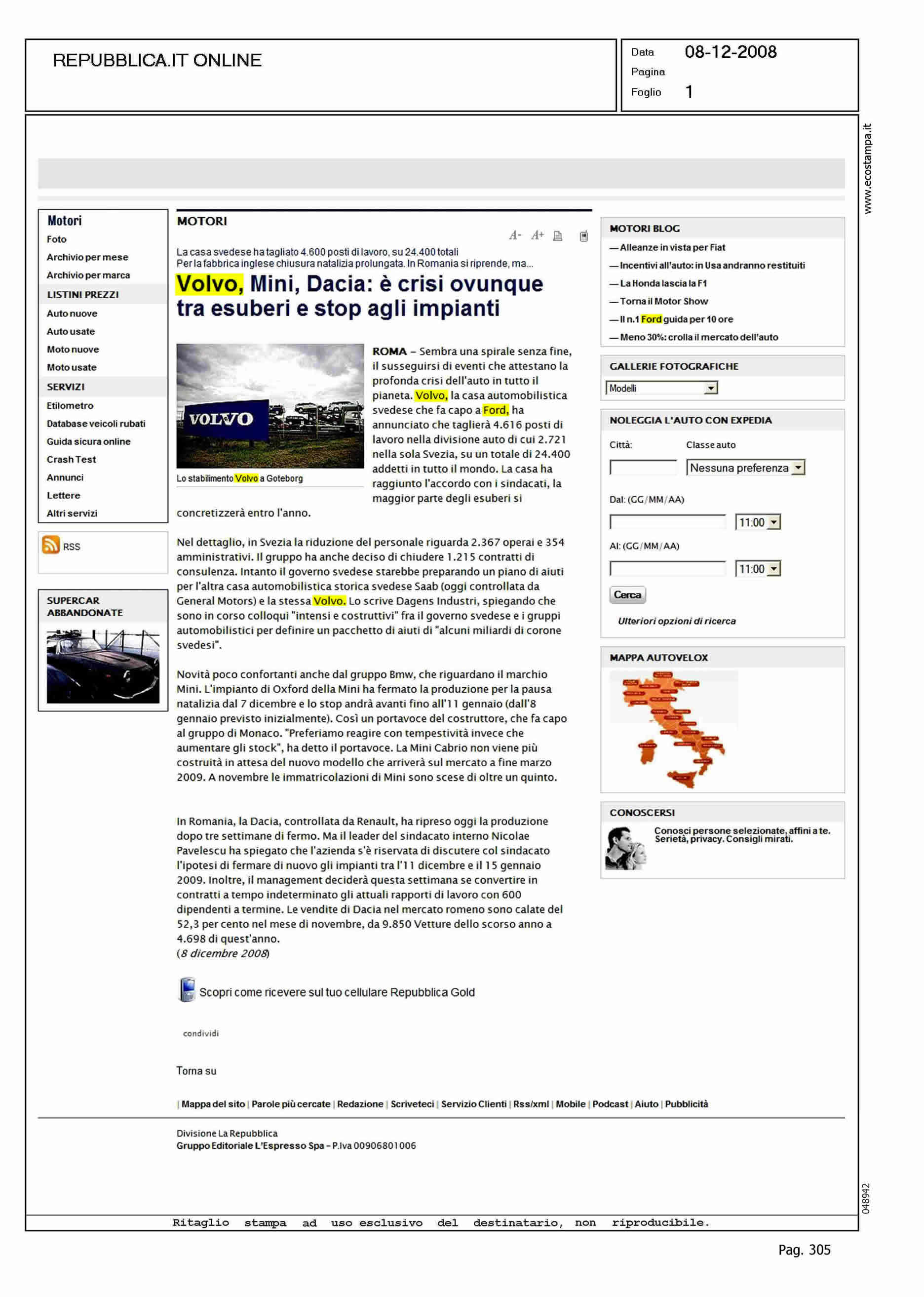Author: Line: Corporate Model: Corporate Subject: NEWS Title: VOLVO, MINI, DACIA: E' CRISI OVUNQUE TRA ESUBERI E STOP AGLI IMPIANTIHighlight: