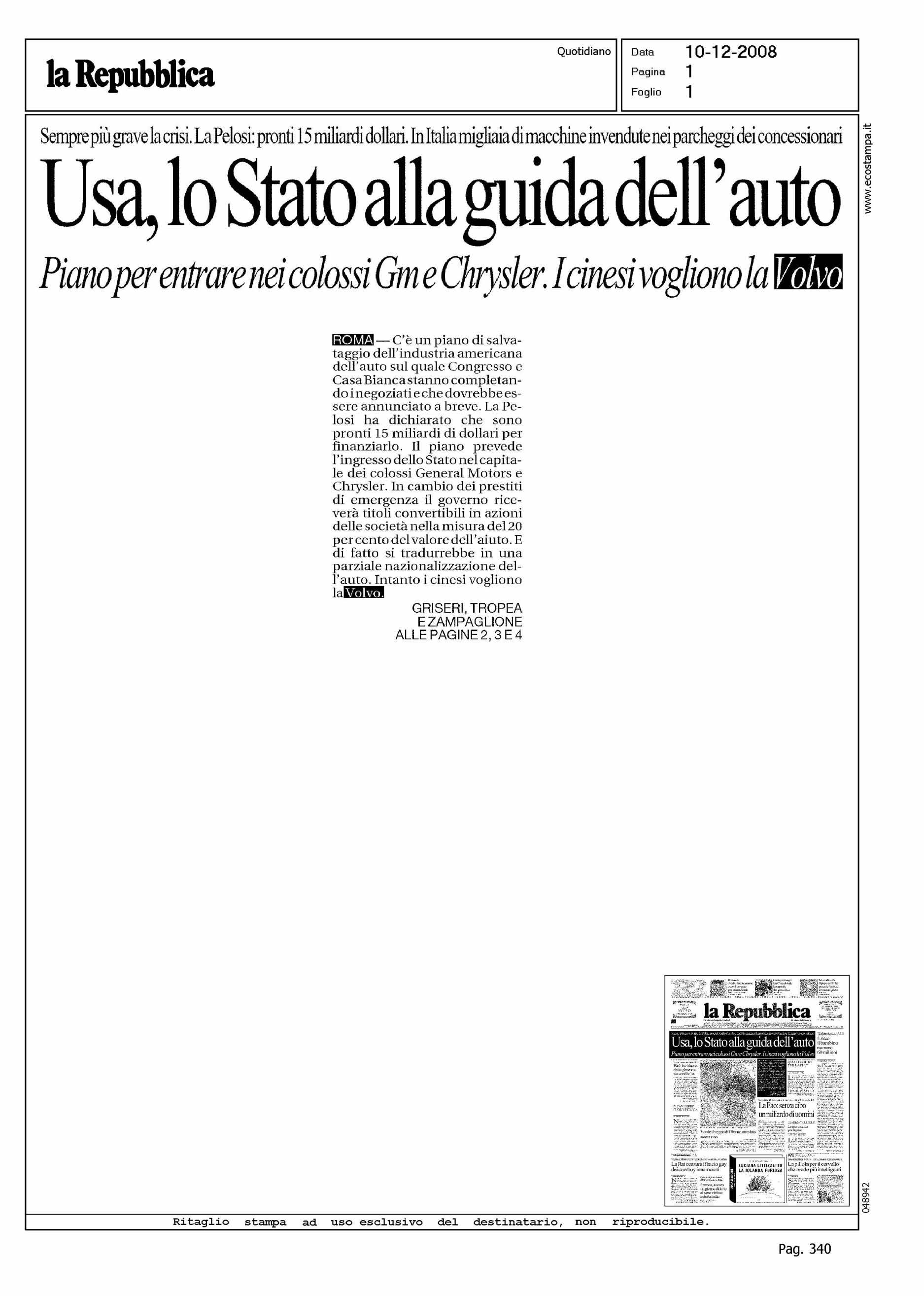 Author: Line: Corporate Model: Corporate Subject: NEWS Title: USA LO STATO ALLA GUIDA DELL'AUTO - I CINESI VOGLIONO LA VOLVOHighlight: