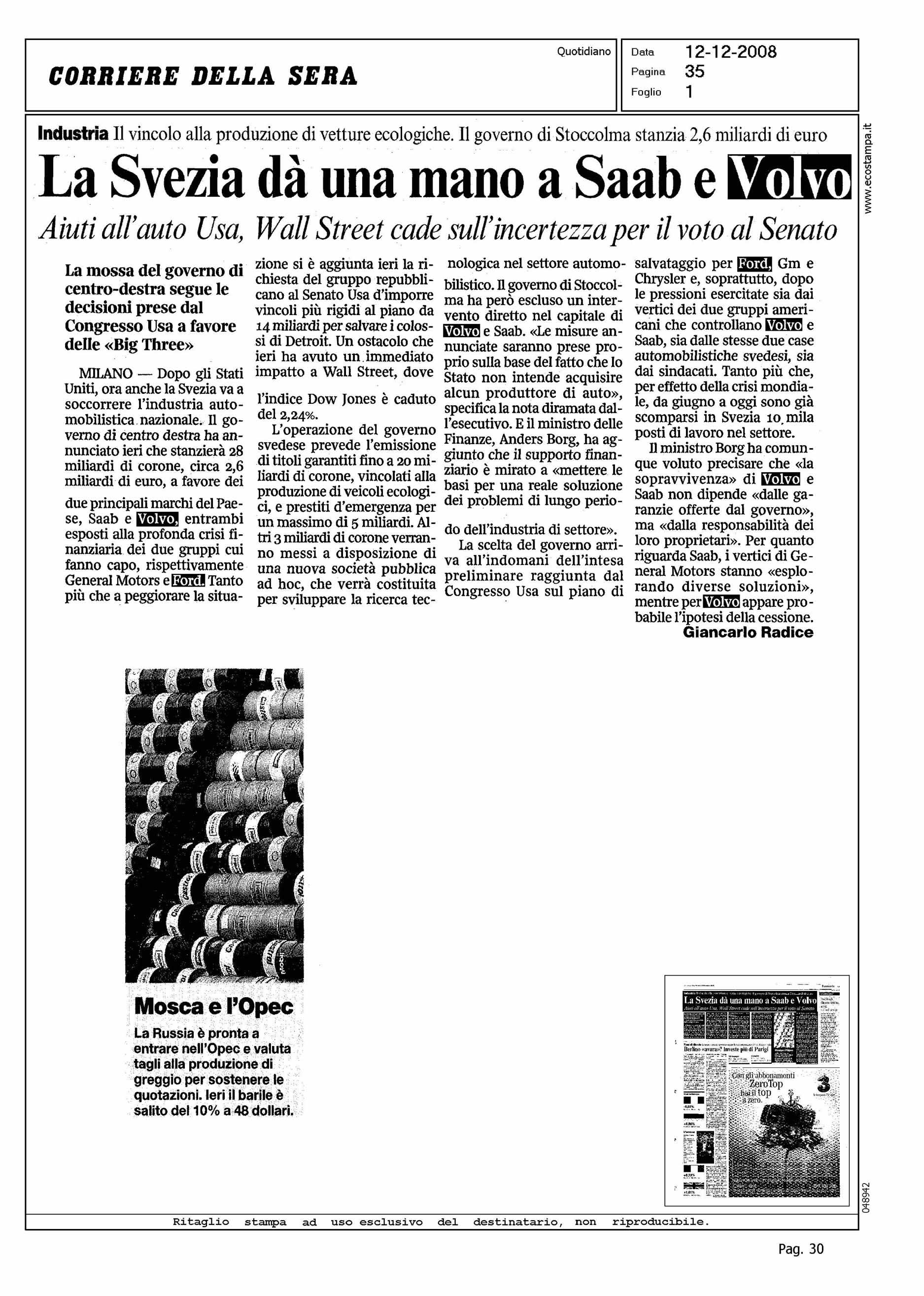 Author: RADICE, GIANCARLOLine: Corporate Model: Corporate Subject: NEWS Title: LA SVEZIA DA' UNA MANO A SAAB E VOLVOHighlight: