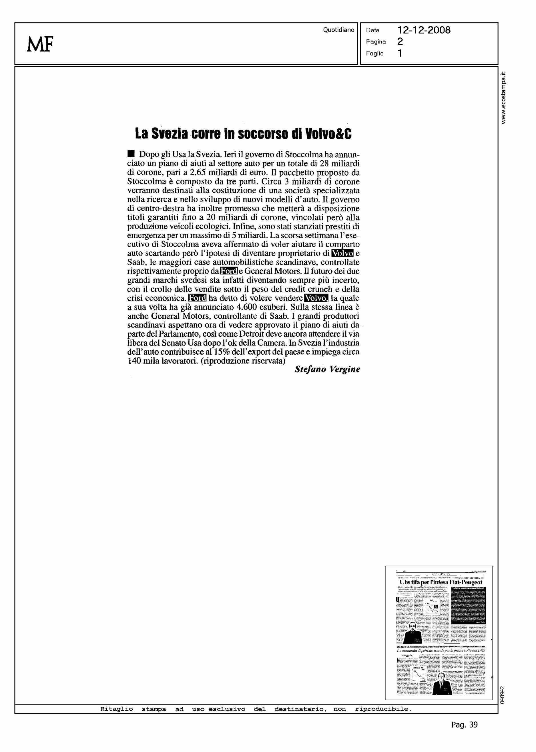 Author: VERGINE, STEFANOLine: Corporate Model: Corporate Subject: NEWS Title: LA SVEZIA CORRE IN SOCCORSO DI VOLVO&CHighlight: