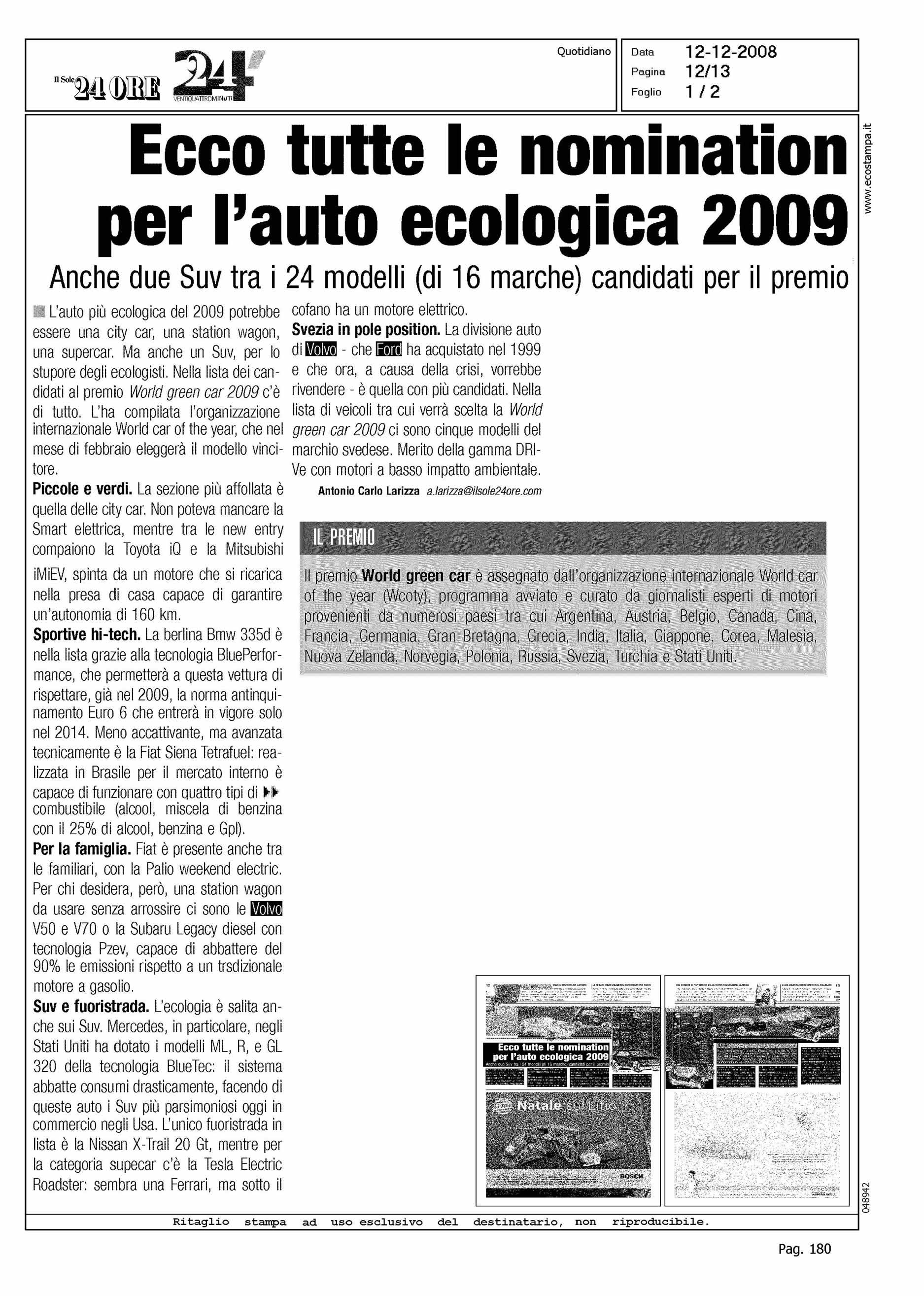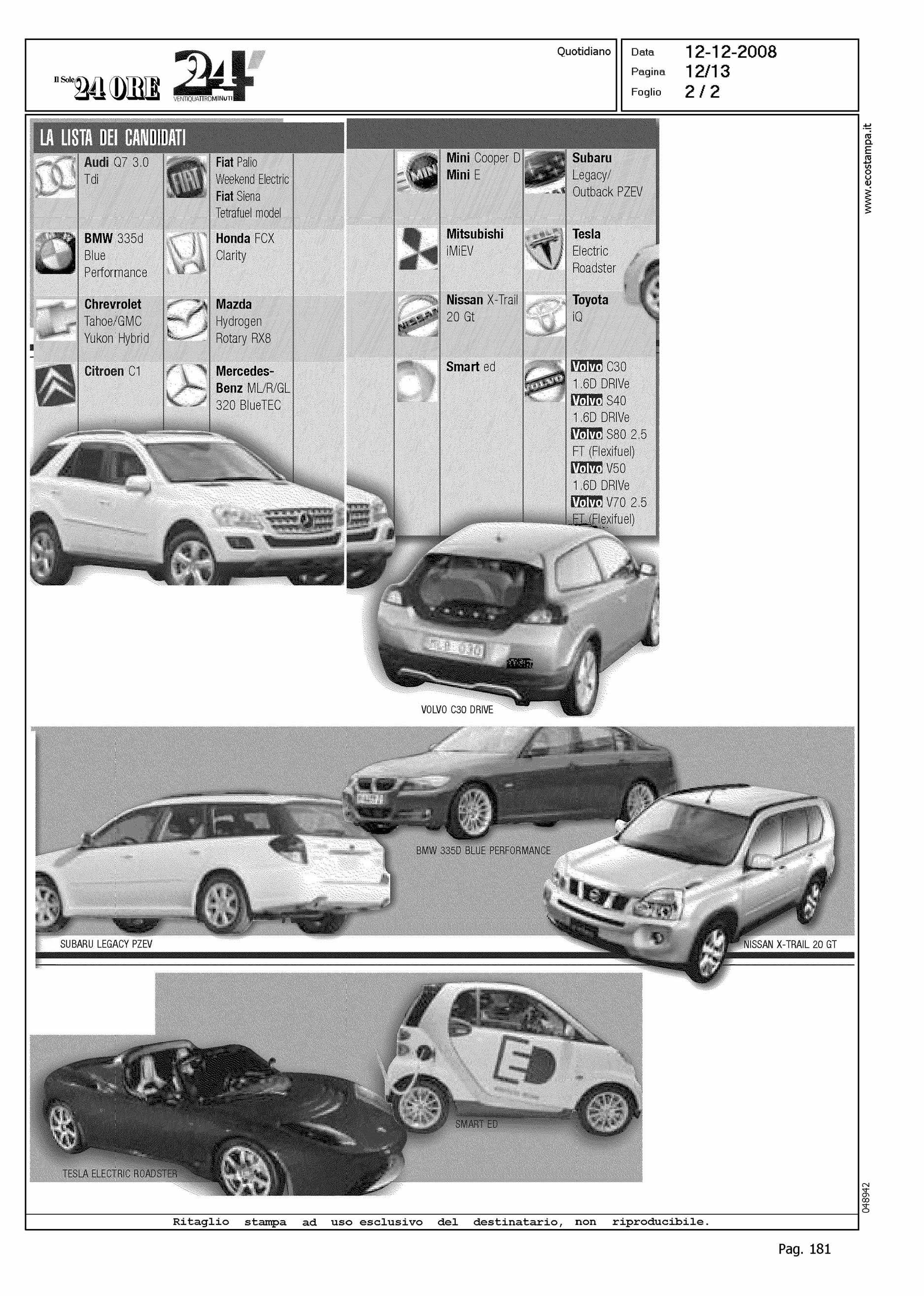 Author: LARIZZA, ANTONIO CARLOLine: Corporate Model: Corporate Subject: C30 RECHARGE Title: ECCO TUTTE LE NOMINATION PER L'AUTO ECOLOGICA 2009Highlight: