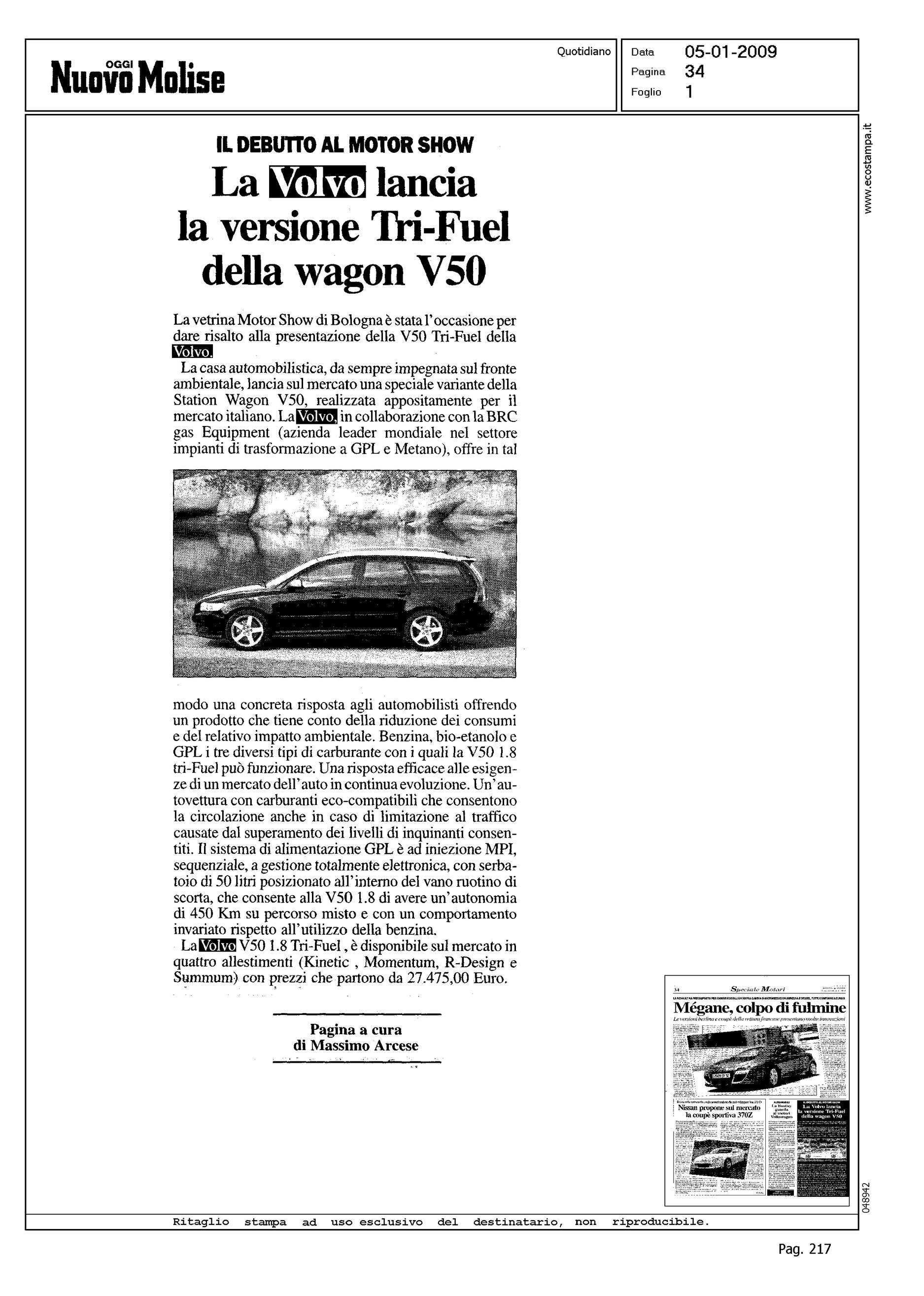 Author: ARCESE, MASSIMOLine: Corporate Model: Volvo S40 - V50 Subject: V50 Tri-Fuel Title: LA VOLVO LANCIA LA VERSIONE TRI-FUEL DELLA WAGON V50Highlight: