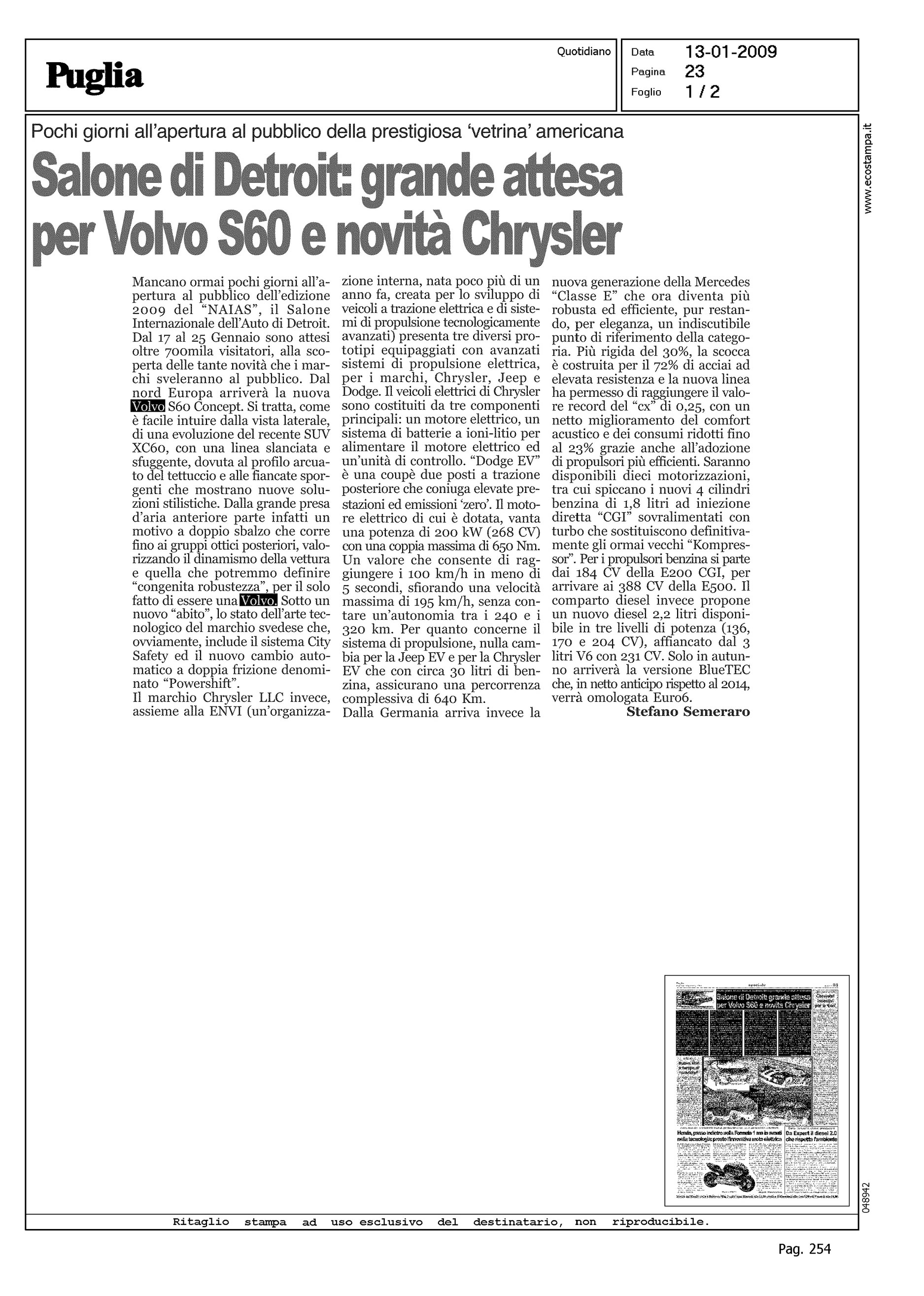 Author: SEMERARO, STEFANOLine: S60 Model: Linea S60 Concept Subject: - Title: SALONE DI DETROIT: GRANDE ATTESA PER VOLVO S60 E NOVITA' CHRYSLERHighlight: