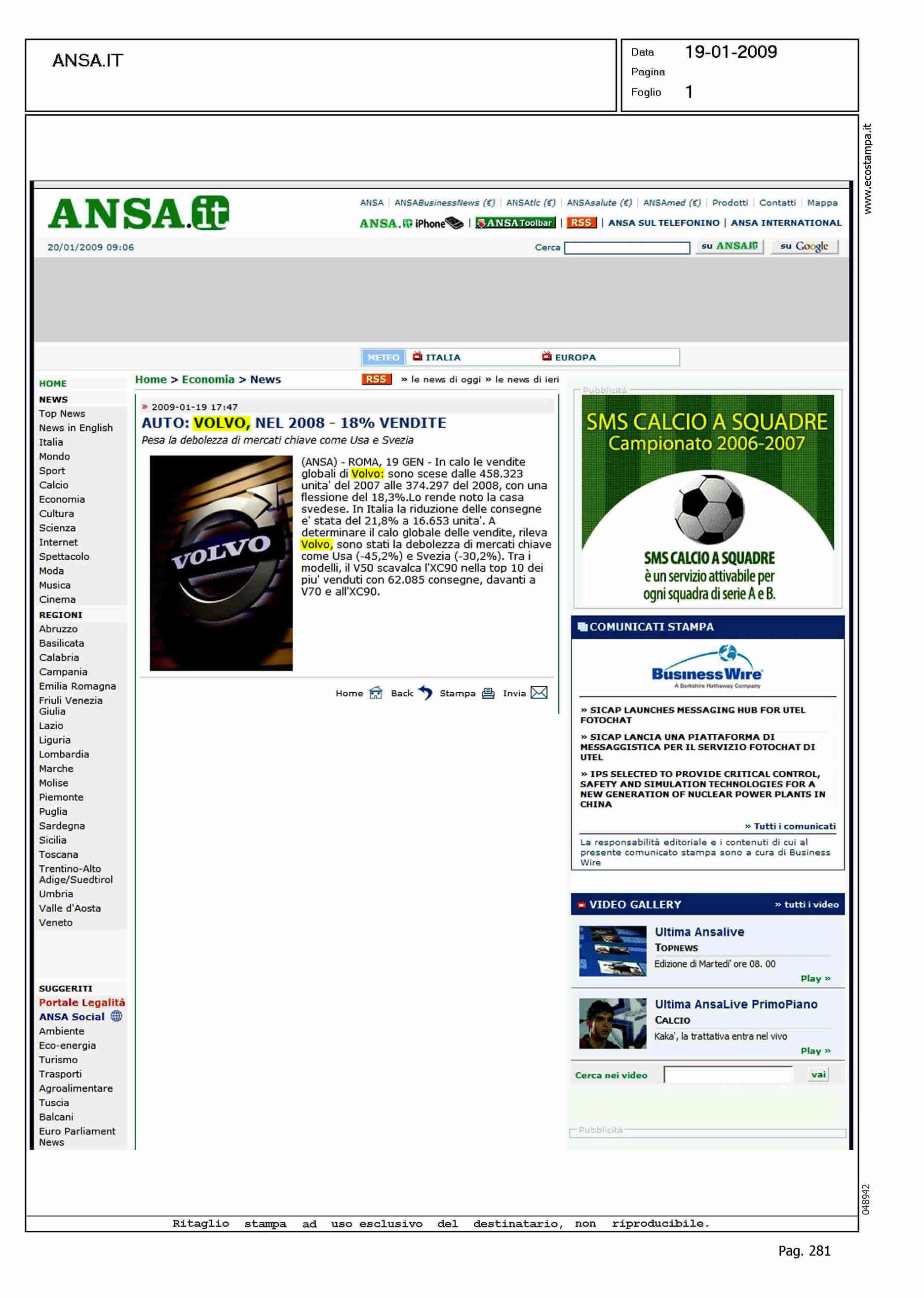 Author: Line: Corporate Model: Corporate Subject: - Title: AUTO: VOLVO, NEL 2008 -18% VENDITEHighlight: