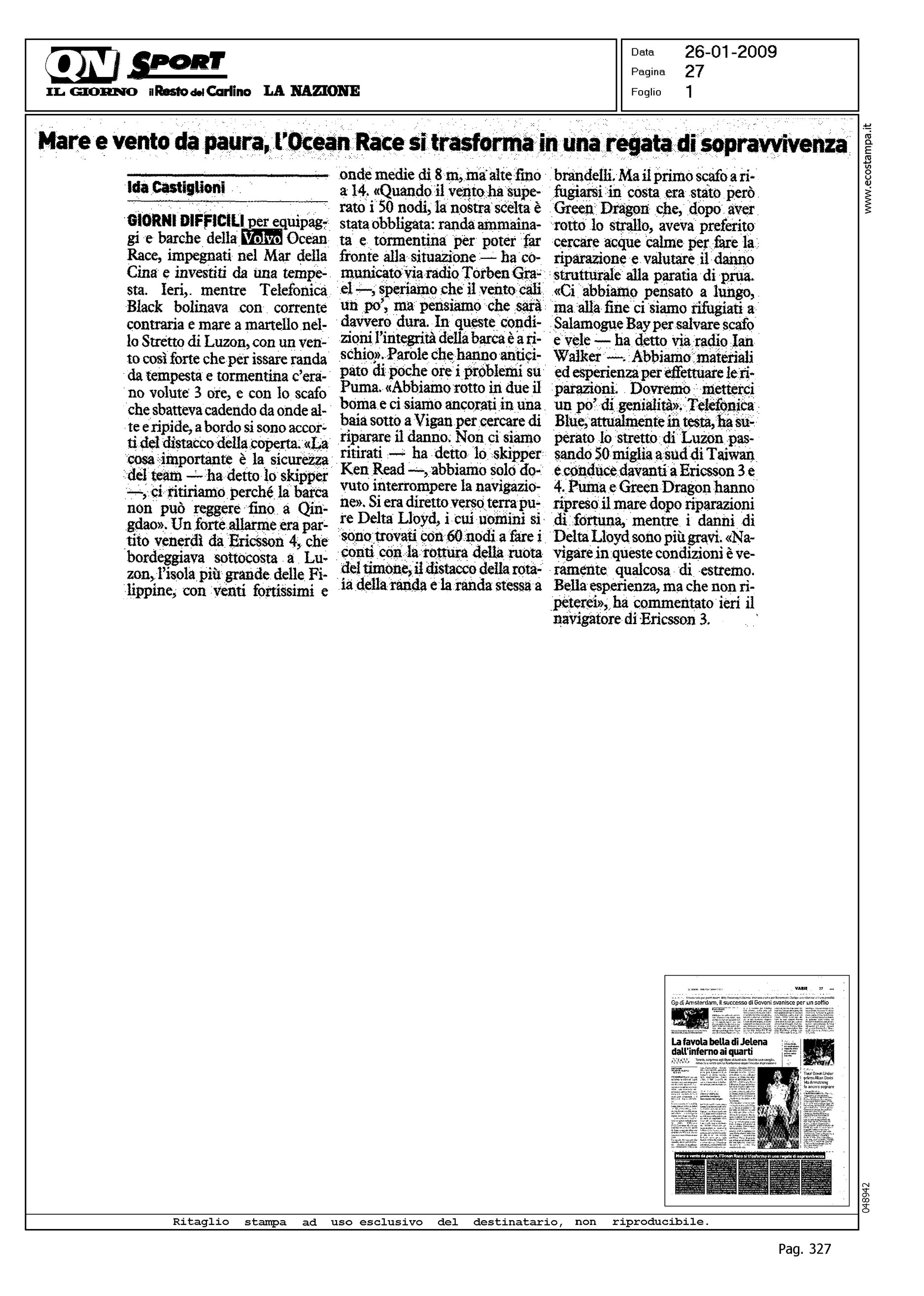 Author: CASTIGLIONI, IDALine: Corporate Model: Corporate Subject: Volvo Ocean Race Title: MARE E VENTO DA PAURA, L'OCEAN RACE SI TRASFORMA IN UNA REGATA DI SOPRAVVIVENZAHighlight: