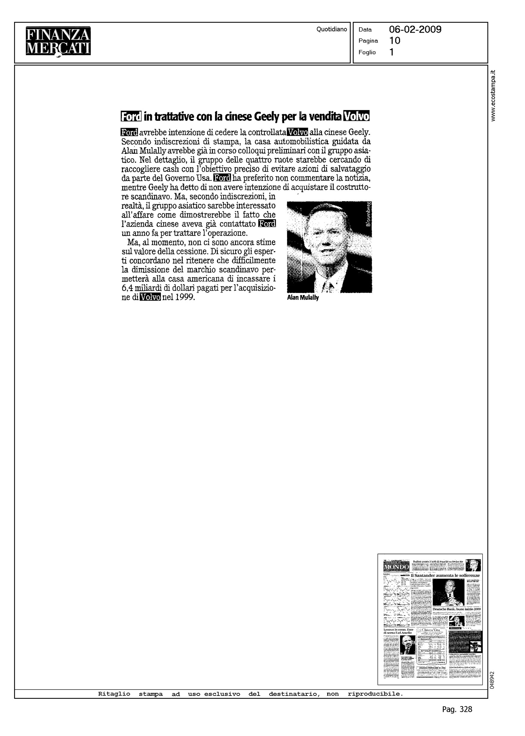 Author: Line: Corporate Model: Corporate Subject: - Title: FORD IN TRATTATIVE CON LA CINESE GEELY PER LA VENDITA VOLVOHighlight: