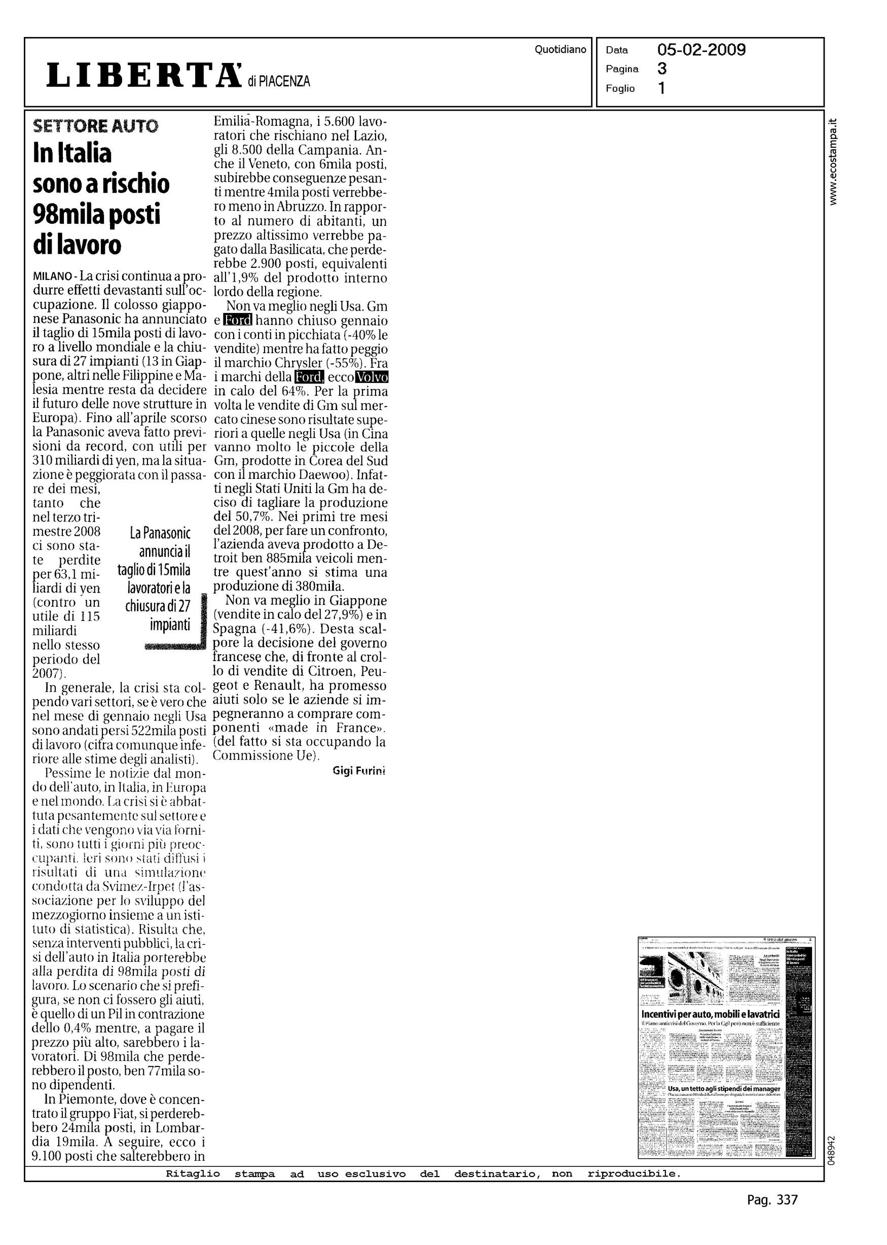 Author: FURINI, GIGILine: Corporate Model: Corporate Subject: - Title: IN ITALIA SONO A RISCHIO 98MILA POSTI DI LAVOROHighlight: