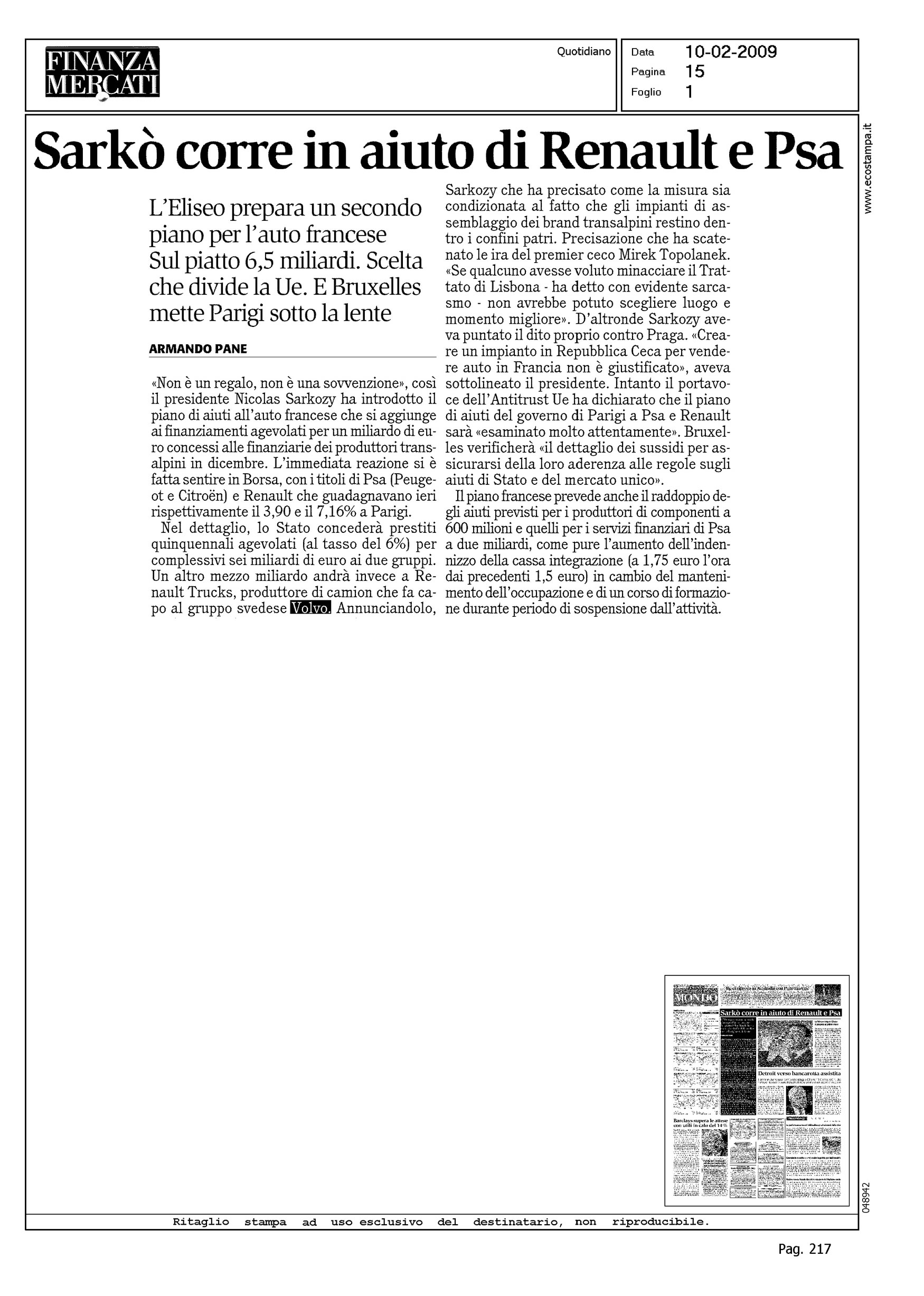 Author: PANE, ARMANDOLine: Corporate Model: Corporate Subject: - Title: SARKO' CORRE IN AIUTO DI RENAULT E PSAHighlight: