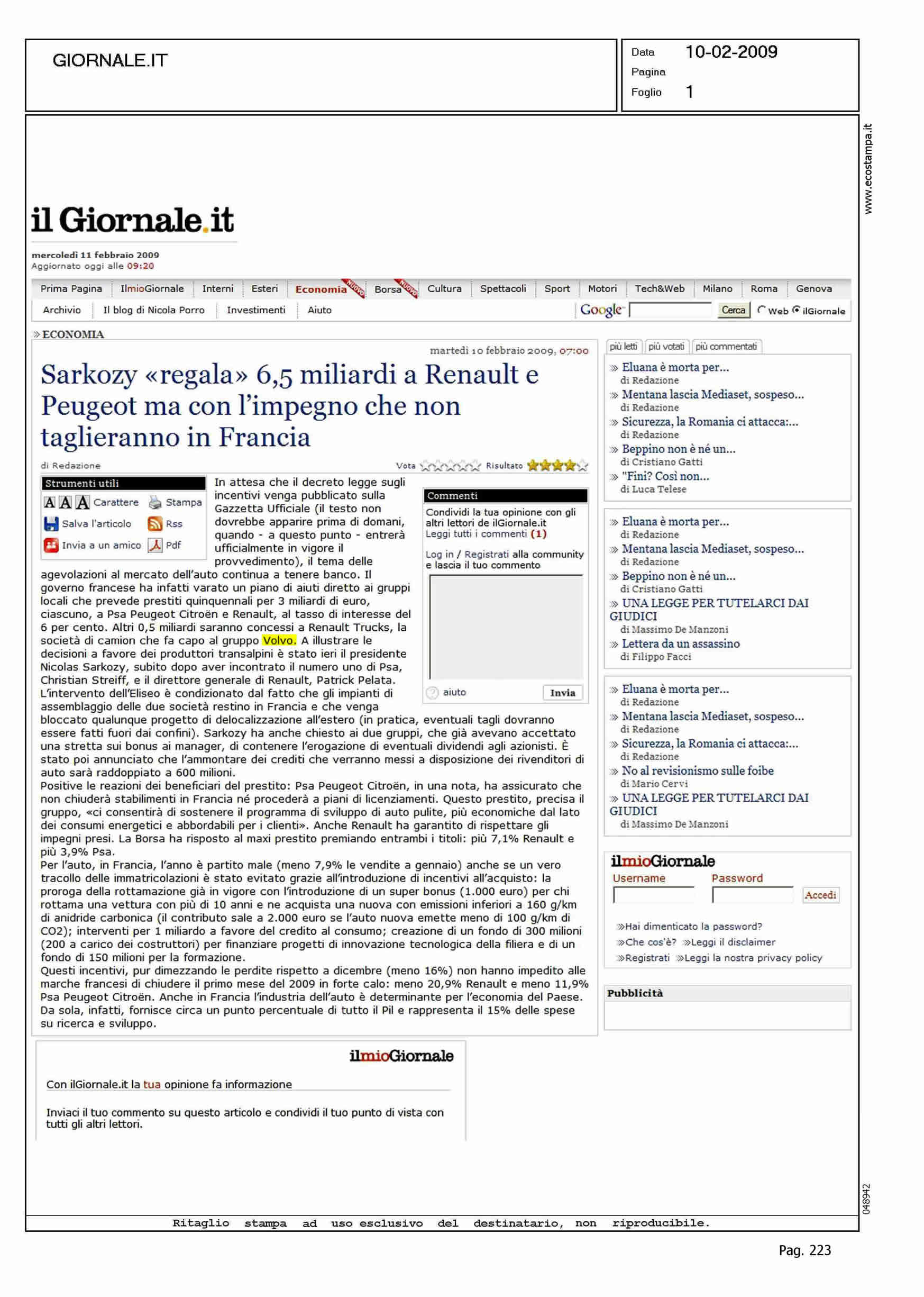Author: Line: Corporate Model: Corporate Subject: - Title: SARKOZY "REGALA" 6,5 MILIARDI A RENAULT E PEUGEOT MA CON L'IMPEGNO CHE NON TAGLIERANNO IN FRANCIAHighlight:
