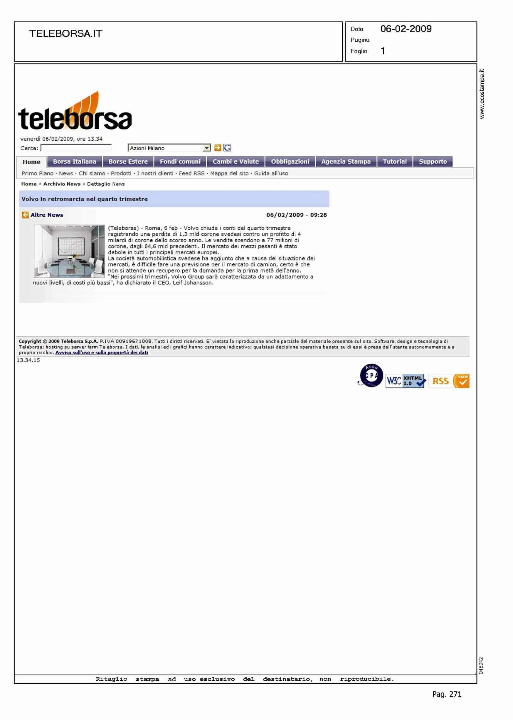 Author: Line: Corporate Model: Corporate Subject: - Title: (TELEBORSA) - Roma, 6 Feb. - Volvo chiude i conti del quarto trimestre...Highlight: