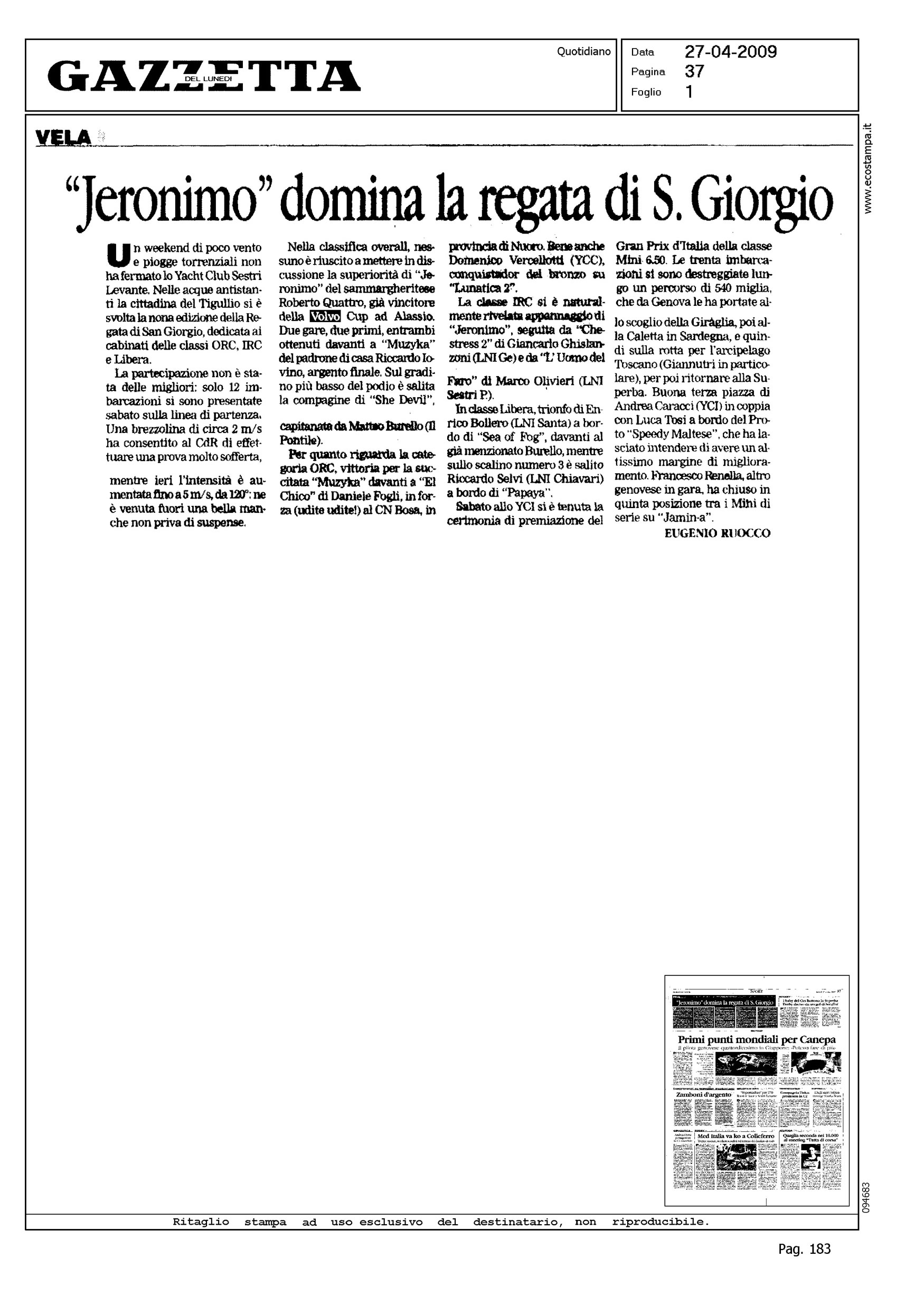 Author: RUOCCO, EUGENIOLine: Corporate Model: Corporate Subject: Volvo Cup Title: "JERONIMO" DOMINA LA REGATA DI S. GIORGIOHighlight: