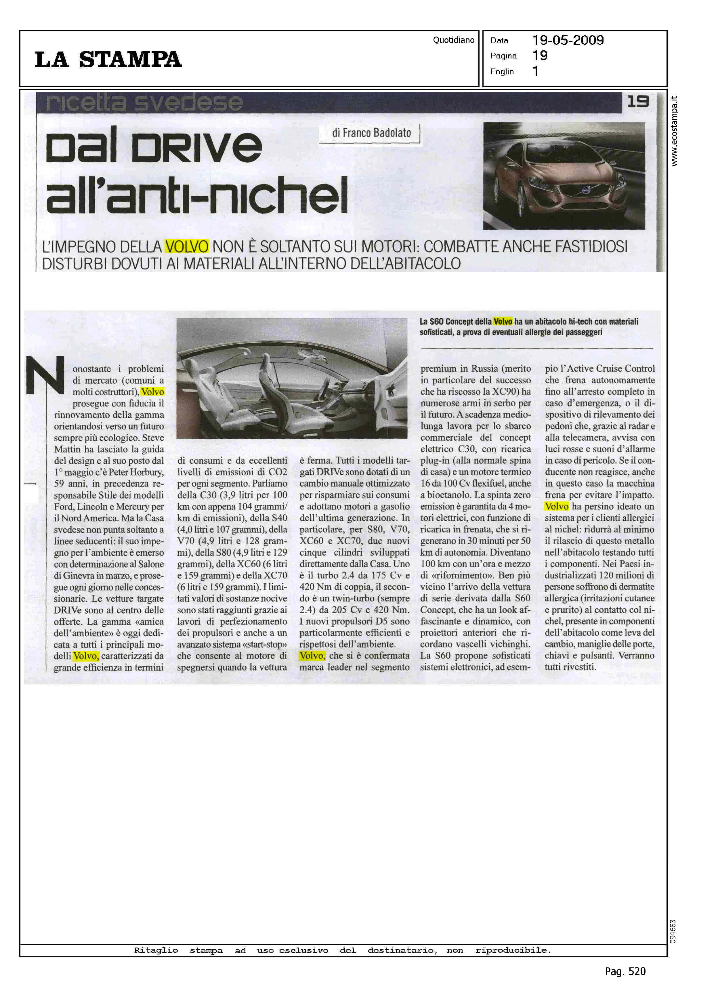 Author: BADOLATO, FRANCOLine: S60 Model: Linea S60 Concept Subject: - Title: DAL DRIVE ALL'ANTI-NICHELHighlight: