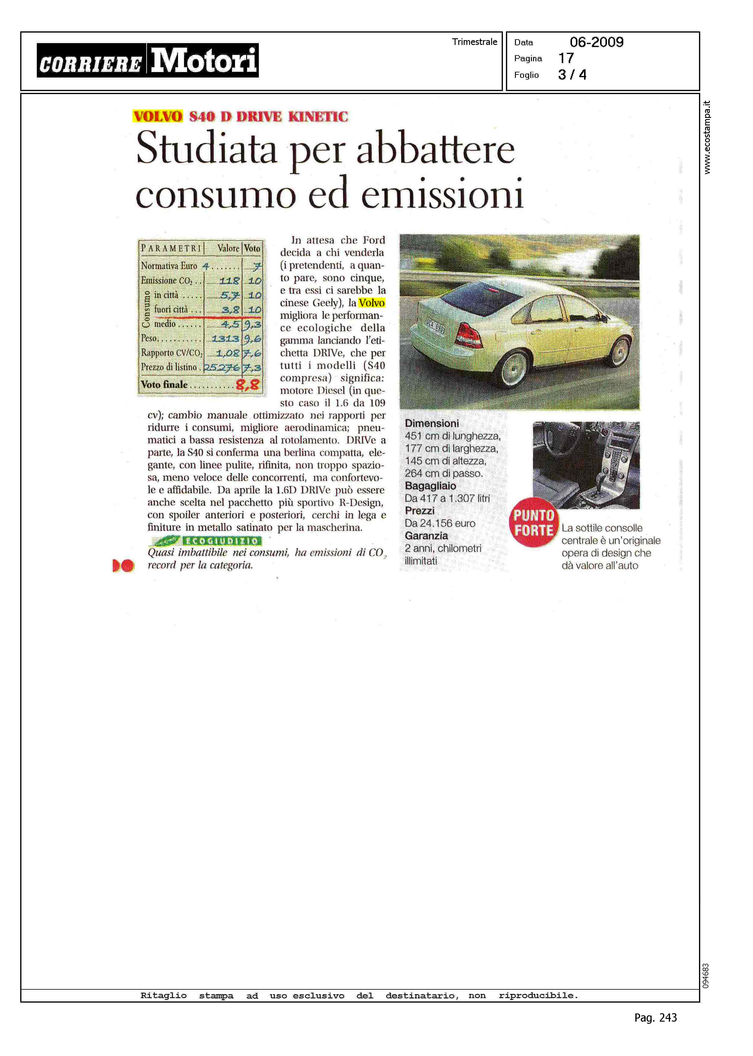 Author: Line: Corporate Model: Volvo S40 - V50 Subject: Line (Range) Drive Title: STUDIATA PER ABBATTERE CONSUMO ED EMISSIONIHighlight: