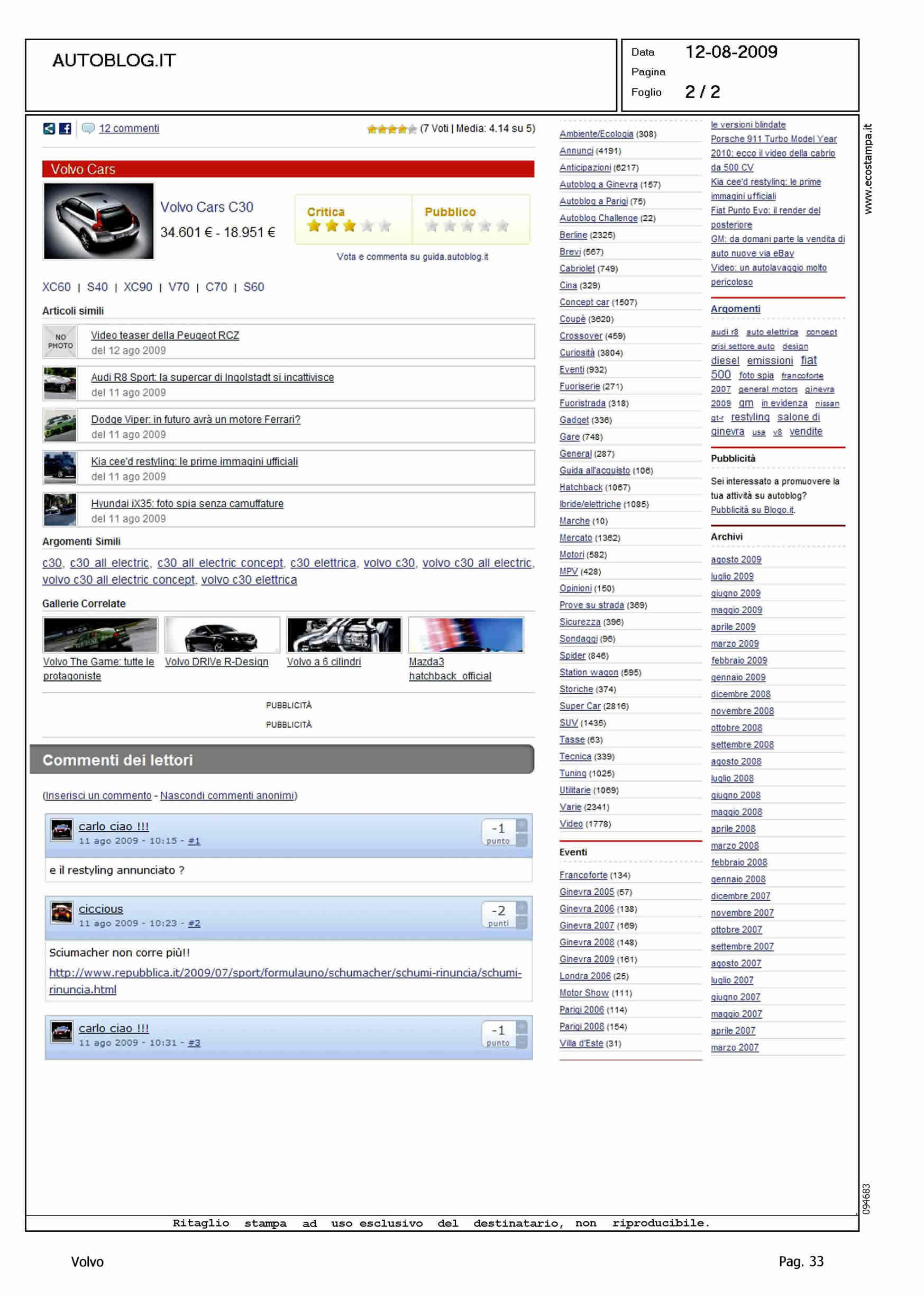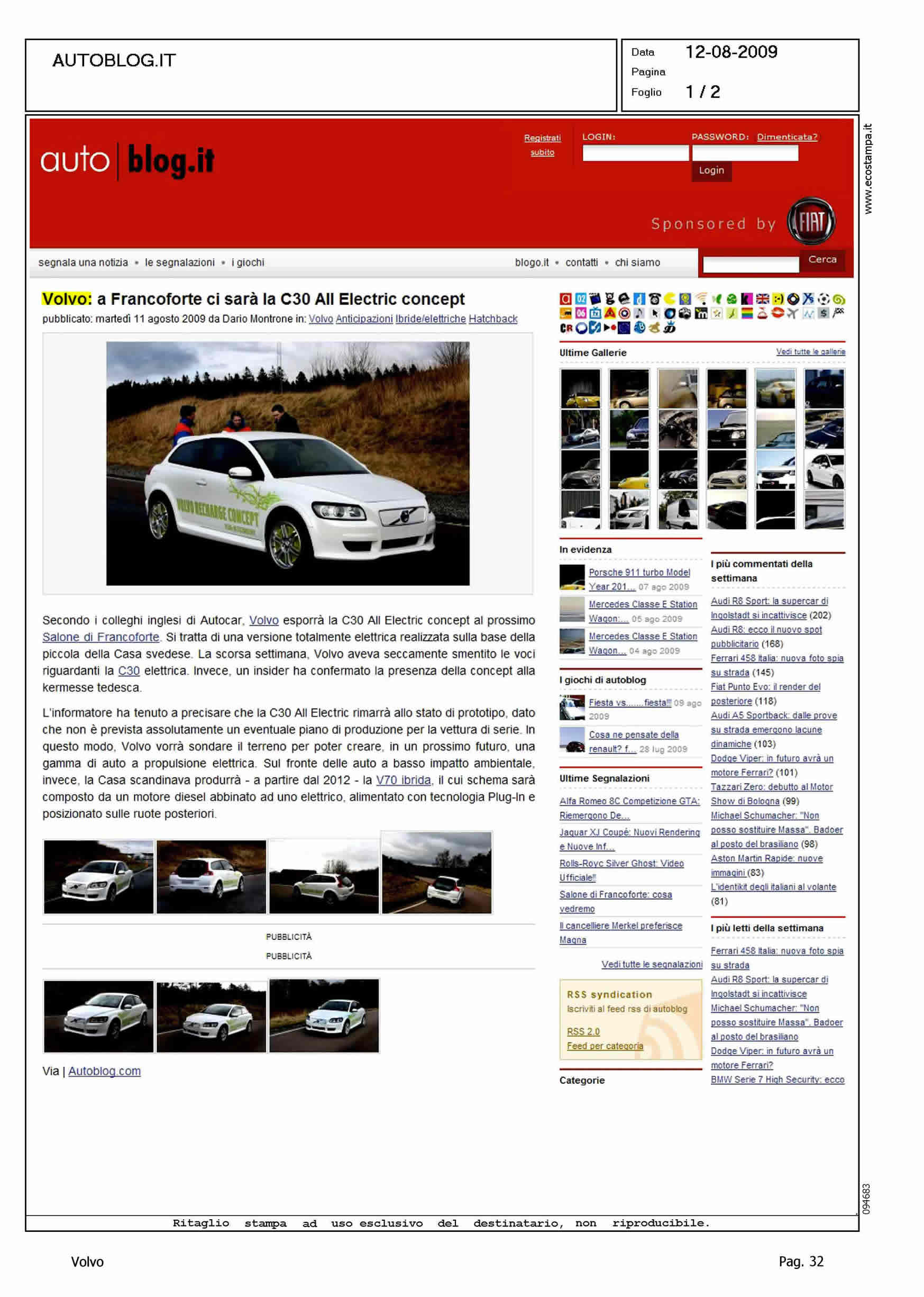 Author: MONTRONE, DARIOLine: Corporate Model: Volvo C30 Subject: C30 ReCharge Title: VOLVO: A FRANCOFORTE CI SARA' LA C30 ALL ELECTRIC CONCEPTHighlight: