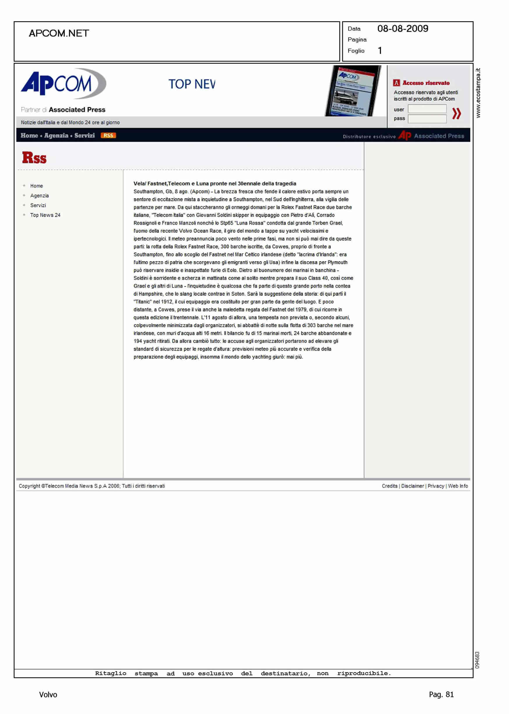 Author: Line: Corporate Model: Subject: Volvo Ocean Race Title: VELA/FASTNET, TELECOM E LUNA PRONTE NEL 30ENNALE DELLA TRAGEDIAHighlight:
