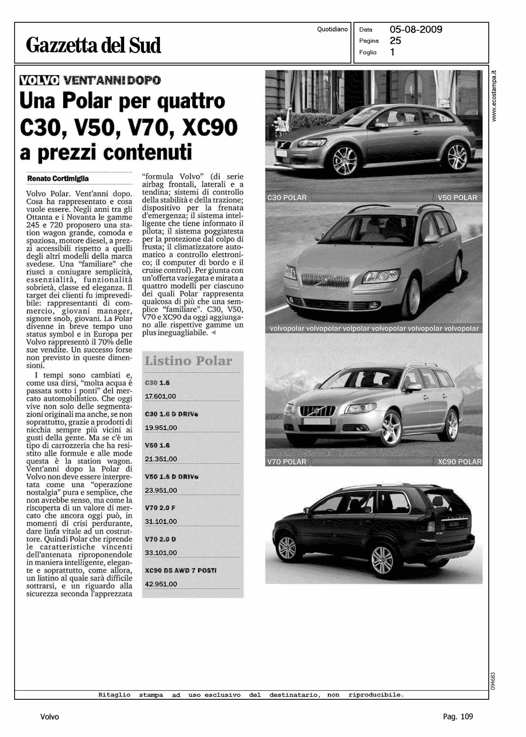 Author: CORTIMIGLIA, RENATOLine: Corporate Model: Corporate Subject: - Title: UNA POLAR PER QUATTRO C30, V50, V70, XC90 A PREZZI CONTENUTIHighlight: