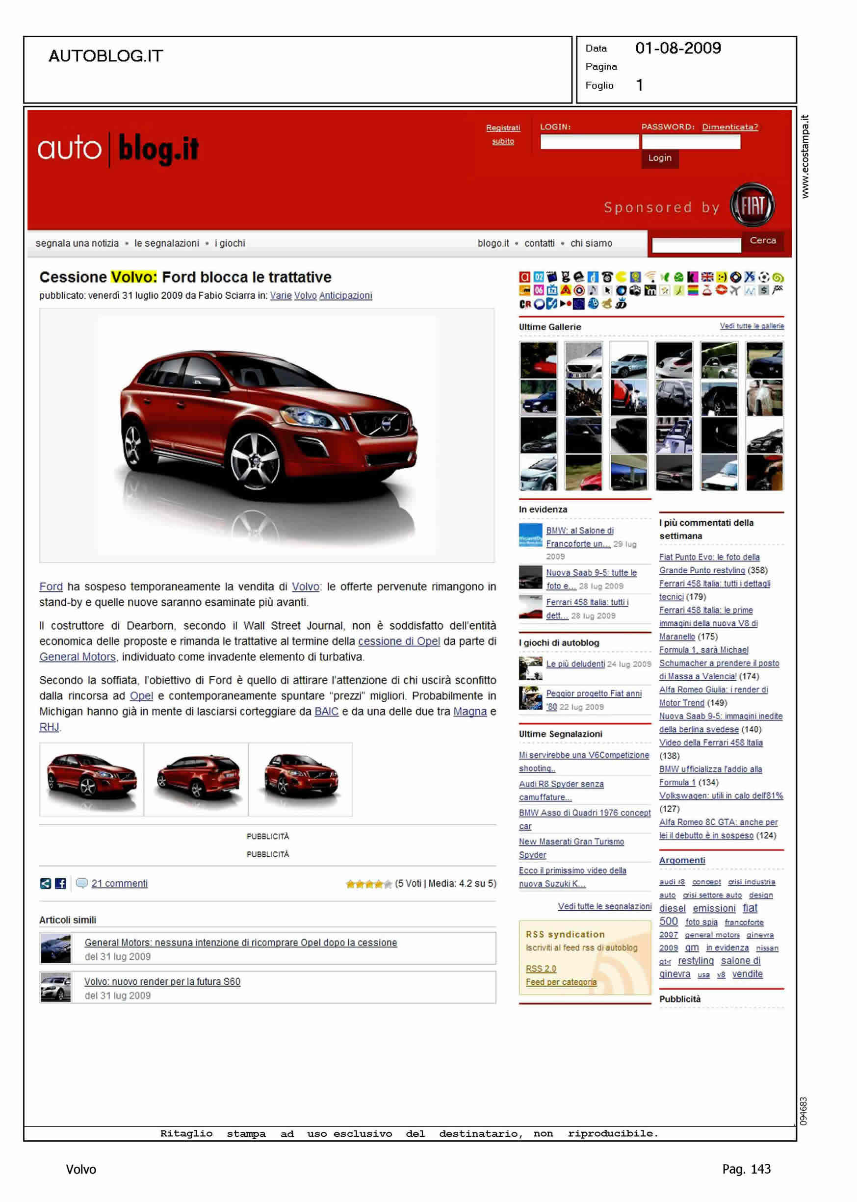 Author: SCIARRA, FABIOLine: Corporate Model: Subject: - Title: CESSIONE VOLVO: FORDO BLOCCA LE TRATTATIVEHighlight: