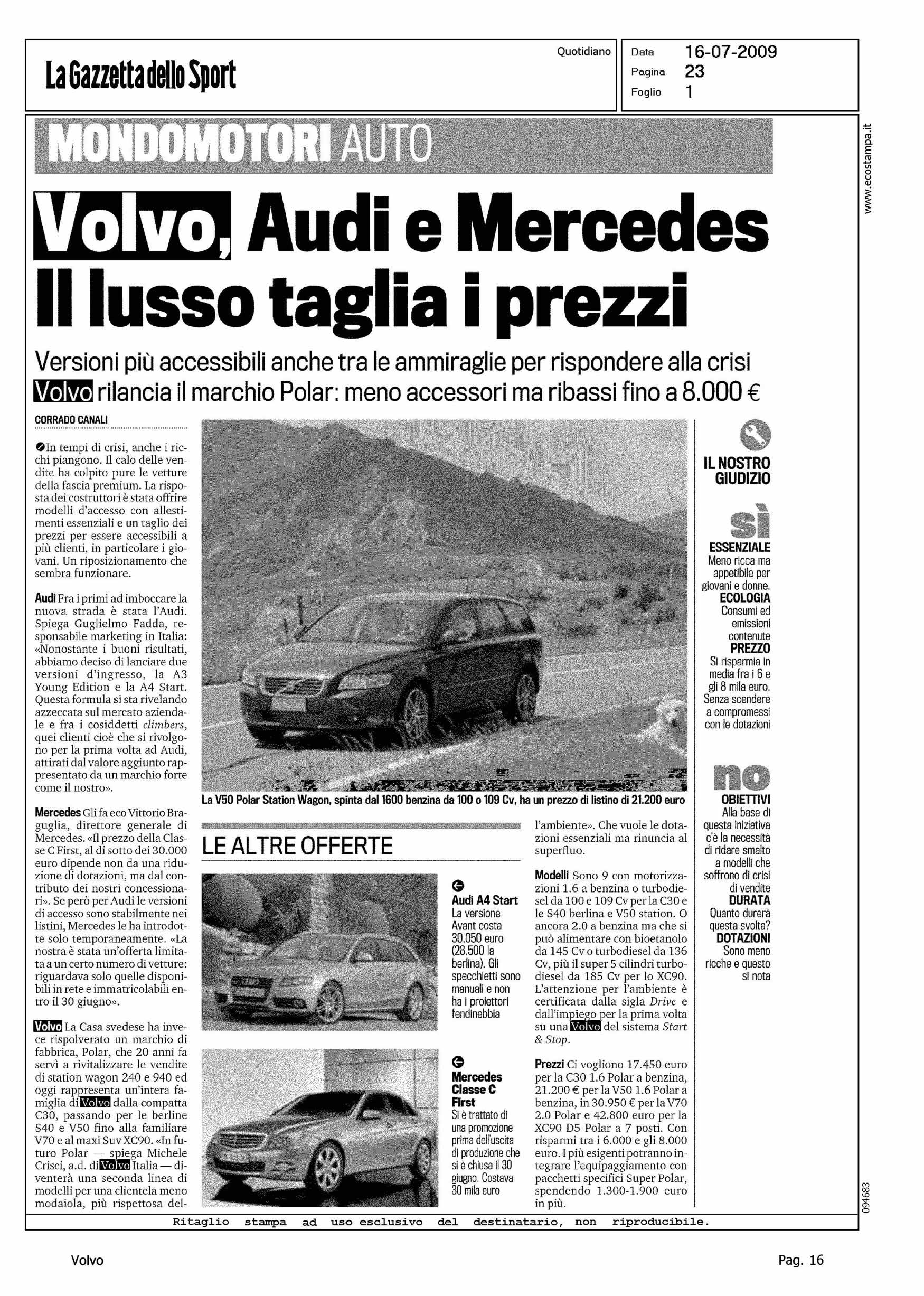 Author: CANALI, CORRADOLine: Corporate Model: Corporate Subject: - Title: VOLVO, AUDI E MERCEDES - IL LUSSO TAGLIA I PREZZIHighlight: