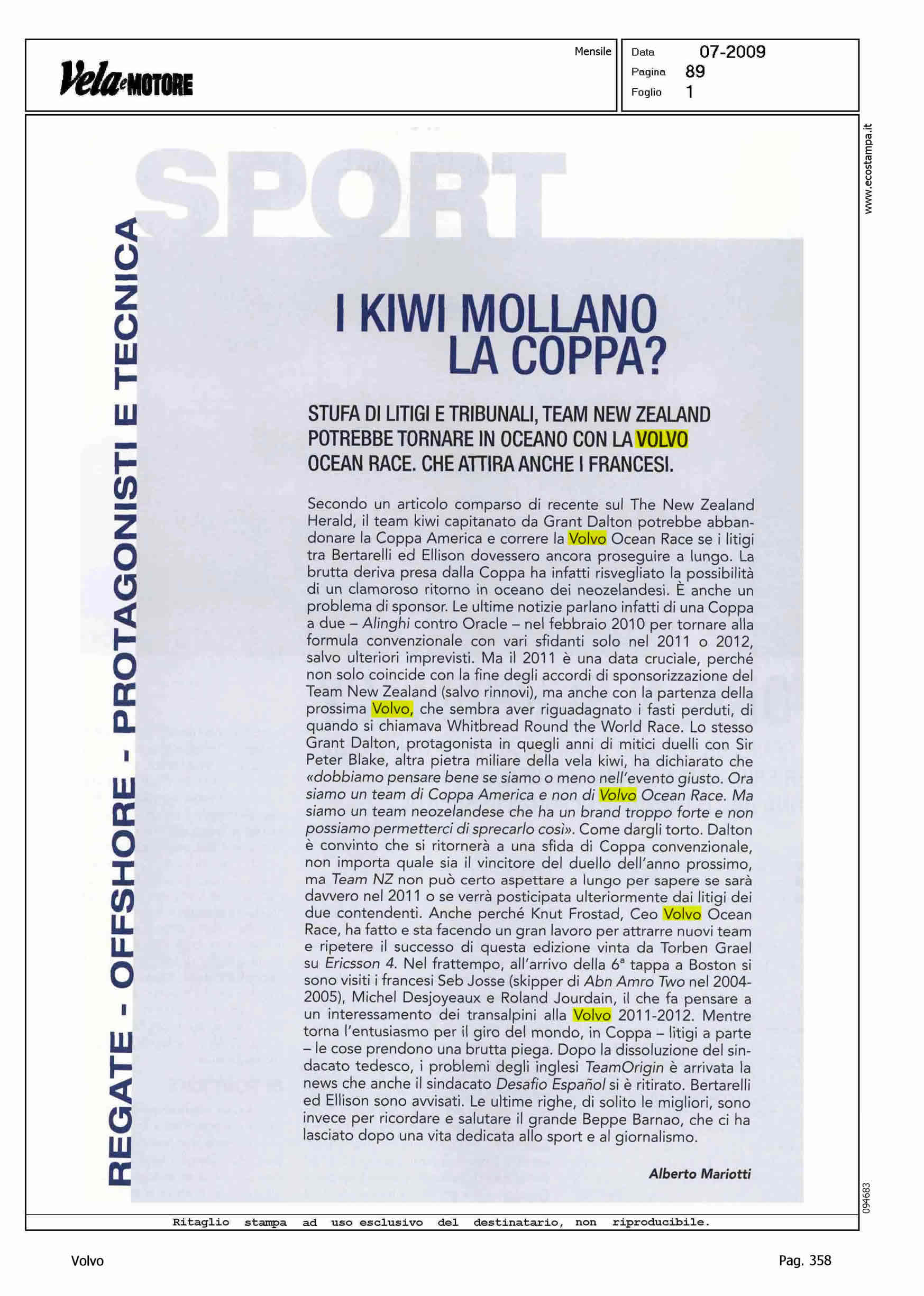 Author: MARIOTTI, ALBERTOLine: Corporate Model: Corporate Subject: Volvo Ocean Race Title: I KIWI MOLLANO LA COPPA? ... TEAM NEW ZEALAND POTREBBE TORNARE IN OCEANO CON LA VOLVO OCEAN RACE...Highlight: