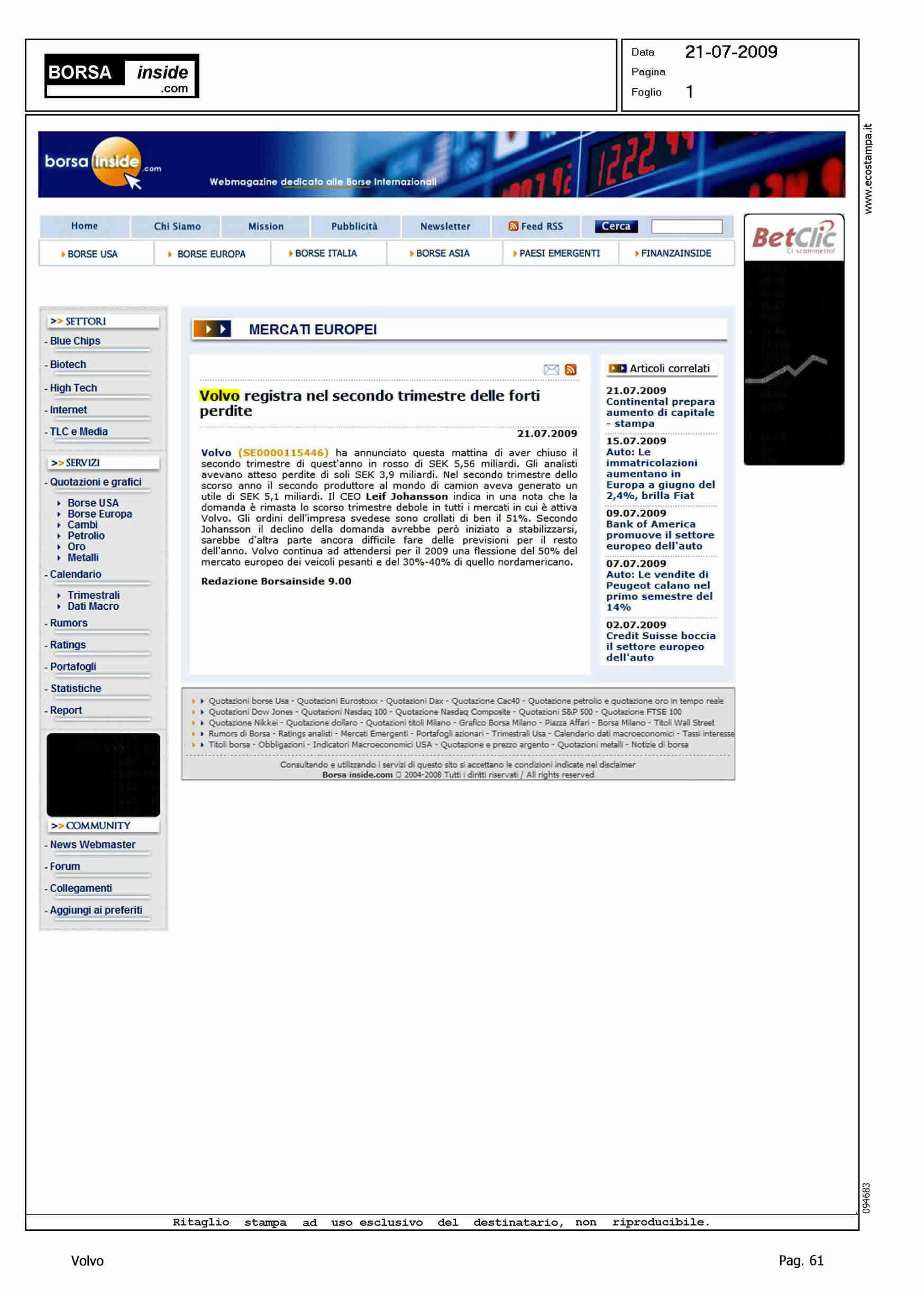 Author: Line: Corporate Model: Corporate Subject: - Title: VOLVO REGISTRA NEL SECONDO TRIMESTRE DELLE FORTI PERDITEHighlight: