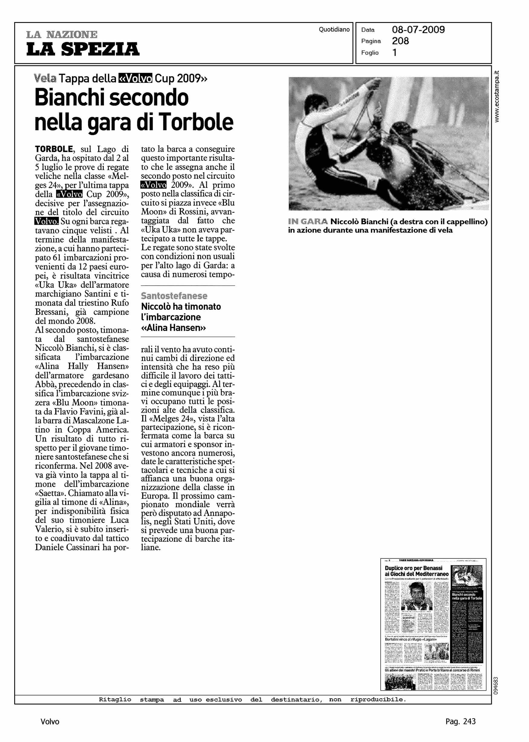 Author: Line: Corporate Model: Corporate Subject: Volvo Cup Title: VELA - TAPPA DELLA "VOLVO CUP 2009" - BIANCHI SECONDO NELLA GARA DI TORBOLEHighlight: