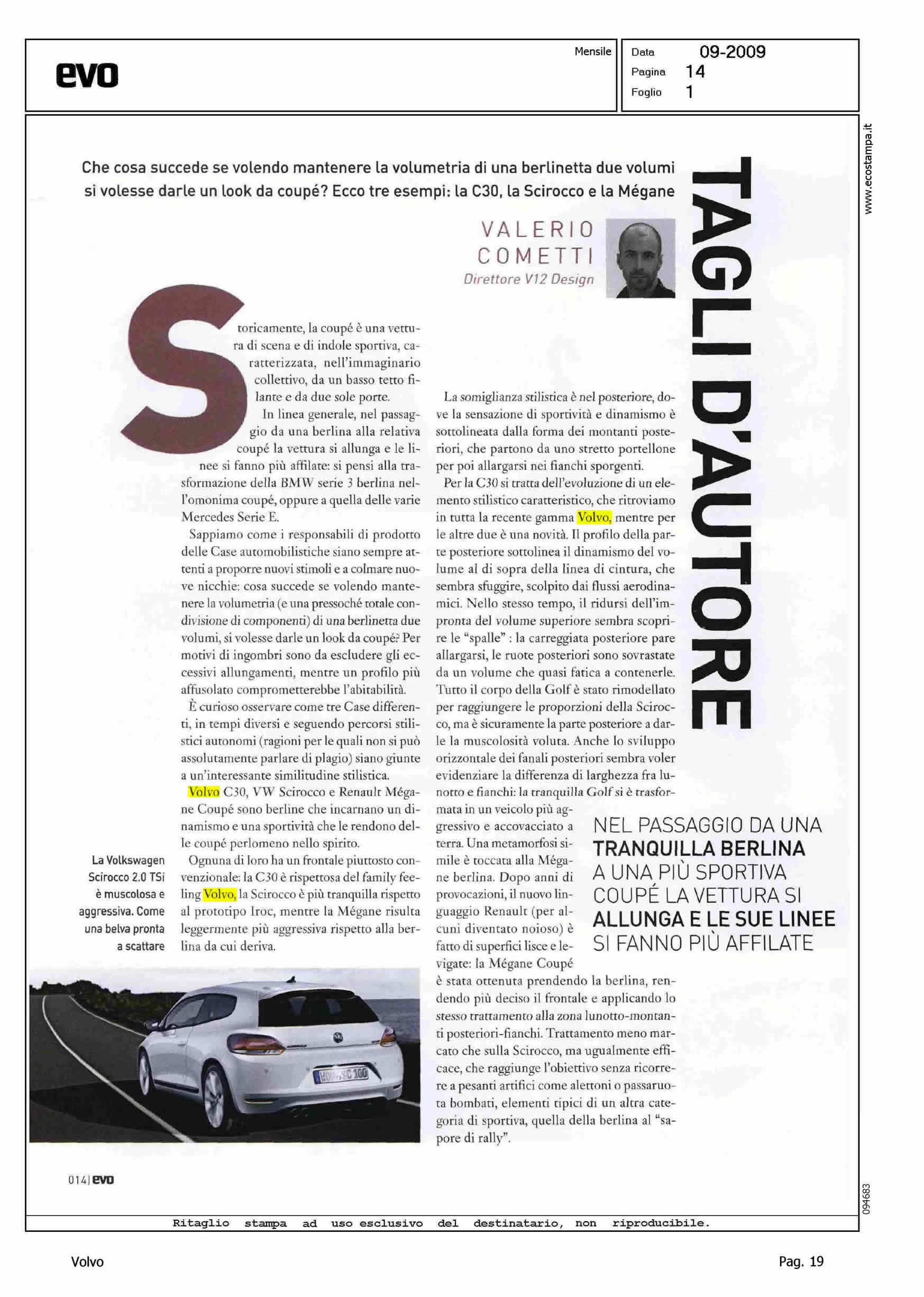 Author: COMETTI, VALERIO (+V12 DESIGN)Line: Corporate Model: Volvo C30 Subject: - Title: TAGLI D'AUTOREHighlight: