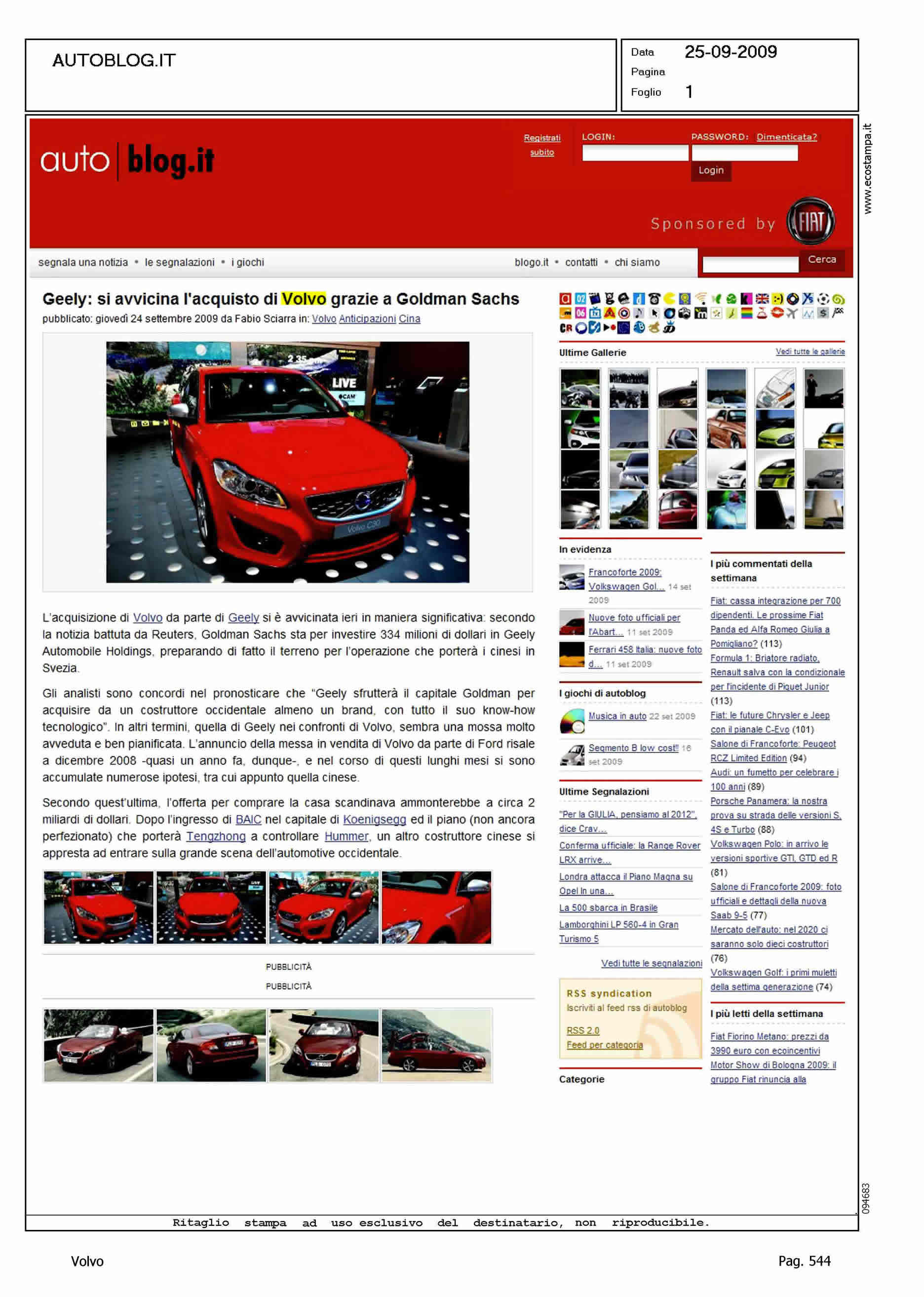 Author: Line: Corporate Model: Corporate Subject: - Title: GEELY: SI AVVICINA L'ACQUISTO VOLVO GRAZIE A GOLDMAN SACHSHighlight:
