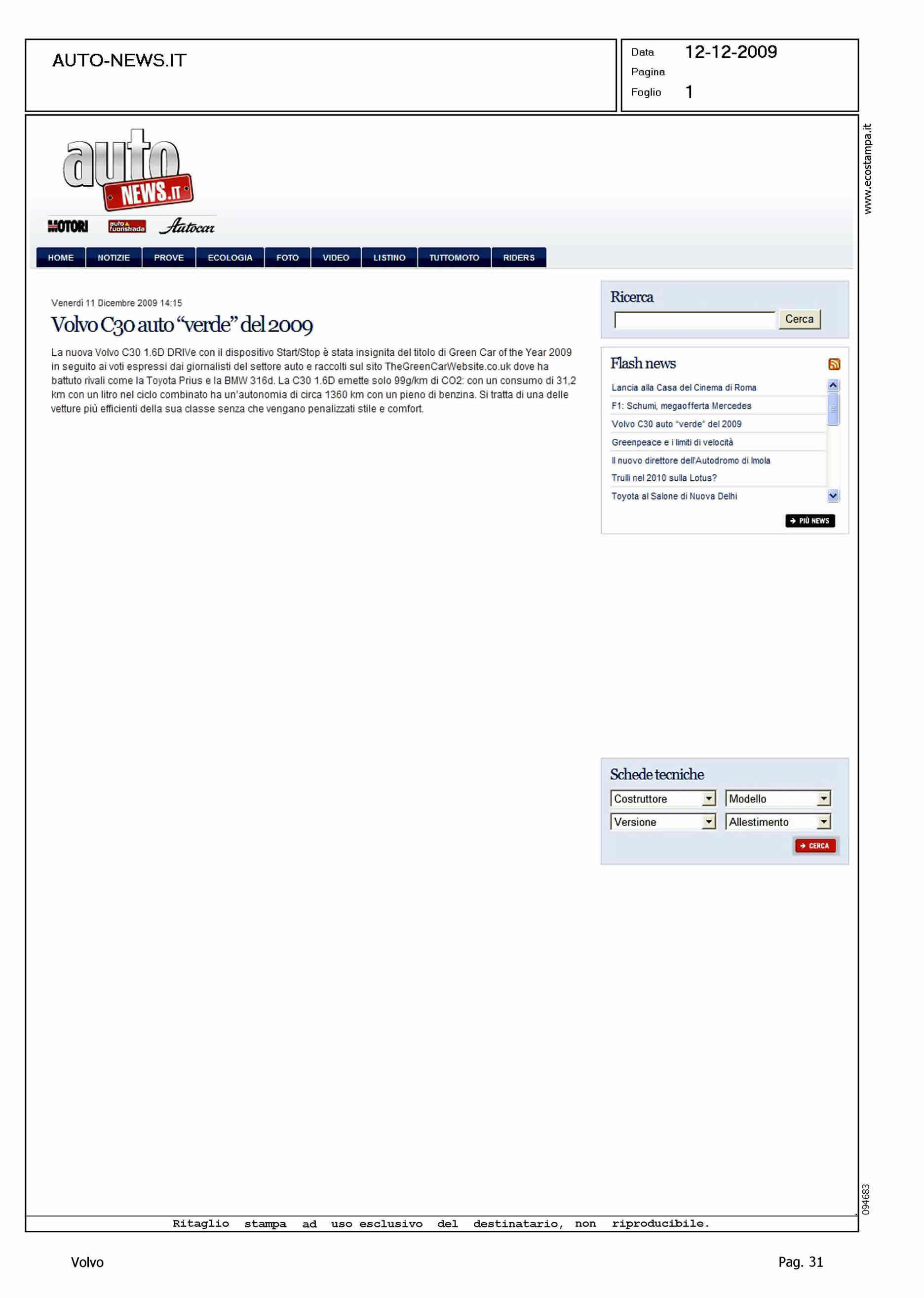 Author: Line: Corporate Model: Volvo C30 Subject: - Title: VOLVO C30 AUTO "VERDE" DEL 2009Highlight: ARTICOLO DATA 12.12 - DRIVe - START/STOP - CO2 X KM - T. PRIUS - BMW 316d - THEGREENCARWEBSITE.CO.UK - CONSUMO - AUTONOMIA