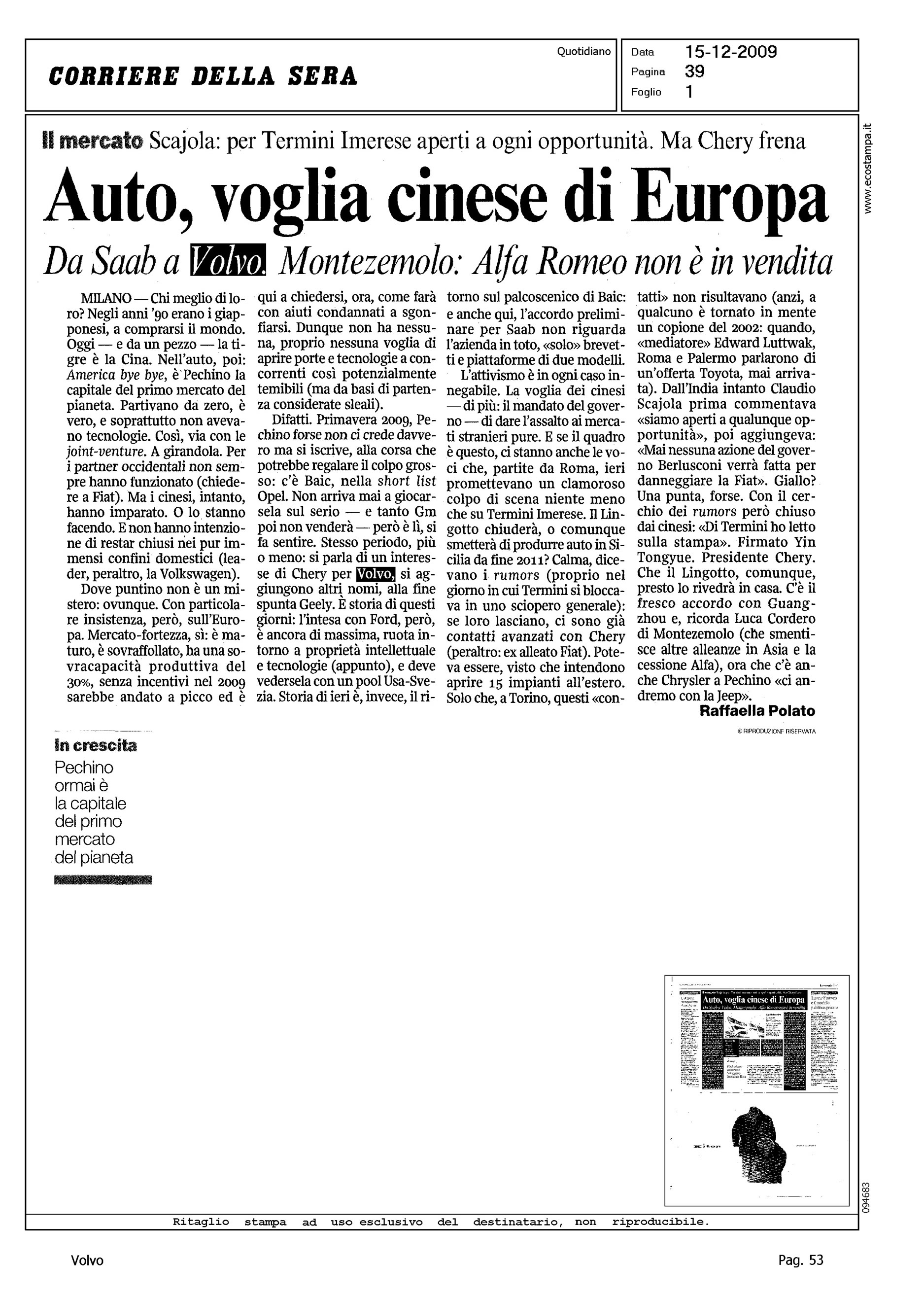 Author: POLATO, RAFFAELLALine: Corporate Model: Corporate Subject: - Title: AUTO, VOGLIA CINESE DI EUROPA - DA SAAB A VOLVO. MONTEZEMOLO: ALFA ROMEO NON E' IN VENDITAHighlight: CITAZIONE TRATTATIVA