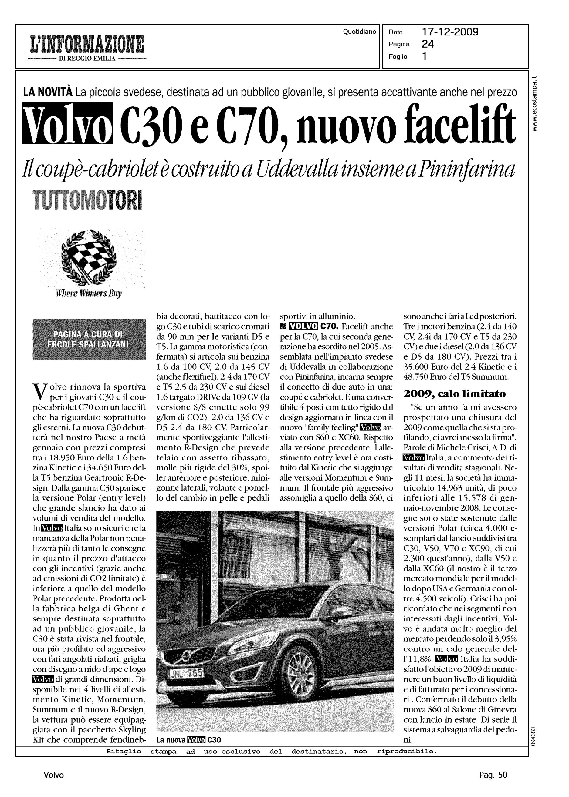 Highlight: C30 - PREZZI - STABILIMENTO DI PRODUZIONE - DESIGN - ALLESTIMENTI - MOTORI - C70 - PININFARINA - DESIGN - ALLESTIMENTI - MOTORI - CRISCI SUL MERCATO ITALIA