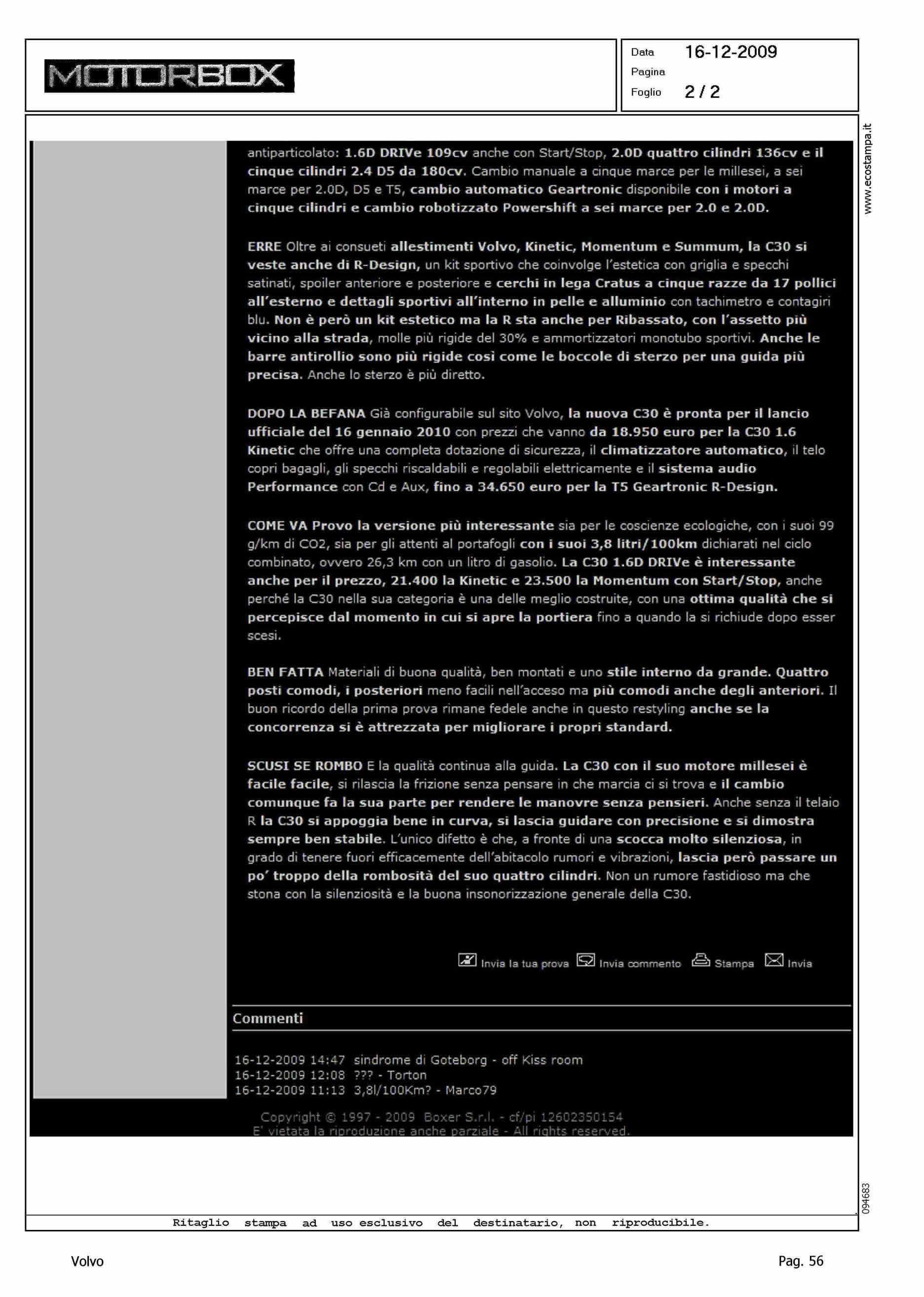 Highlight: ARTICOLO CON DATA 16-12-2009 - TARGET - PROFILO DI MISSIONE - DESIGN - ALLESTIMENTI - MOTORE - PREZZI - DINAMICA DI MARCIA - C30 1.6 DRIVe RUMOROSITA' MOTORE