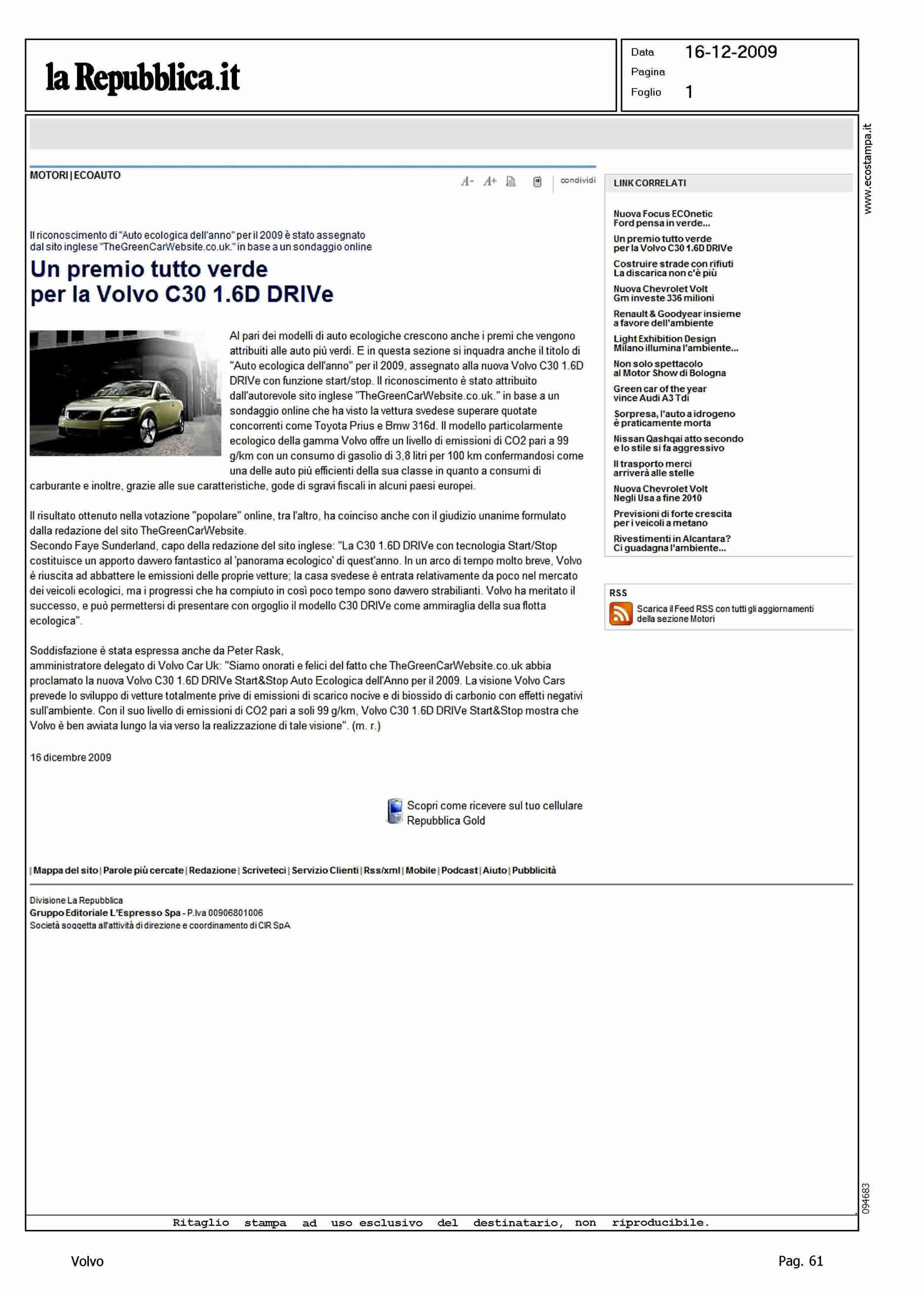 Title: UN PREMIO TUTTO VERDE PER LA VOLVO C30 1.6D DRIVe
