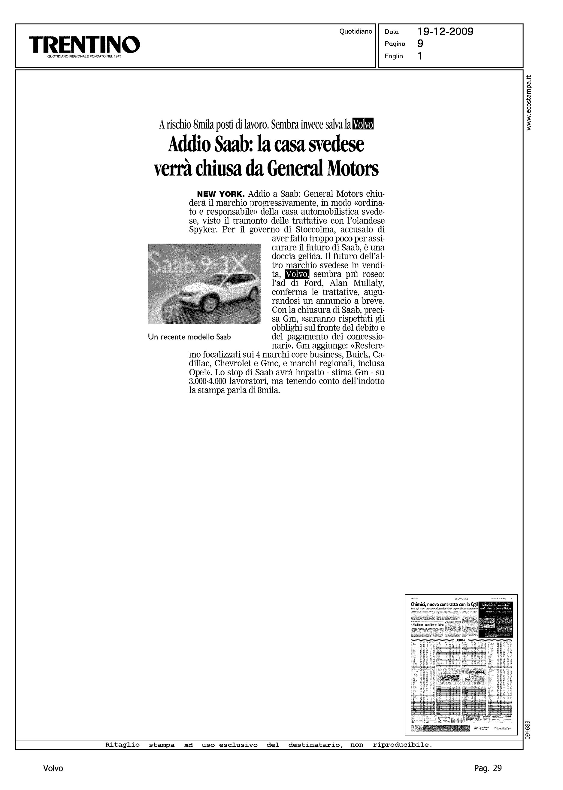 Author: Line: Corporate Model: Corporate Subject: - Title: A RISCHIO 8MILA POSTI DI LAVORO. SEMBRA INVECE SALVA LA VOLVO - ADDIO SAAB: LA CASA SVEDESE VERRA' CHIUSA DA GENERAL MOTORSHighlight: TRATTATIVA