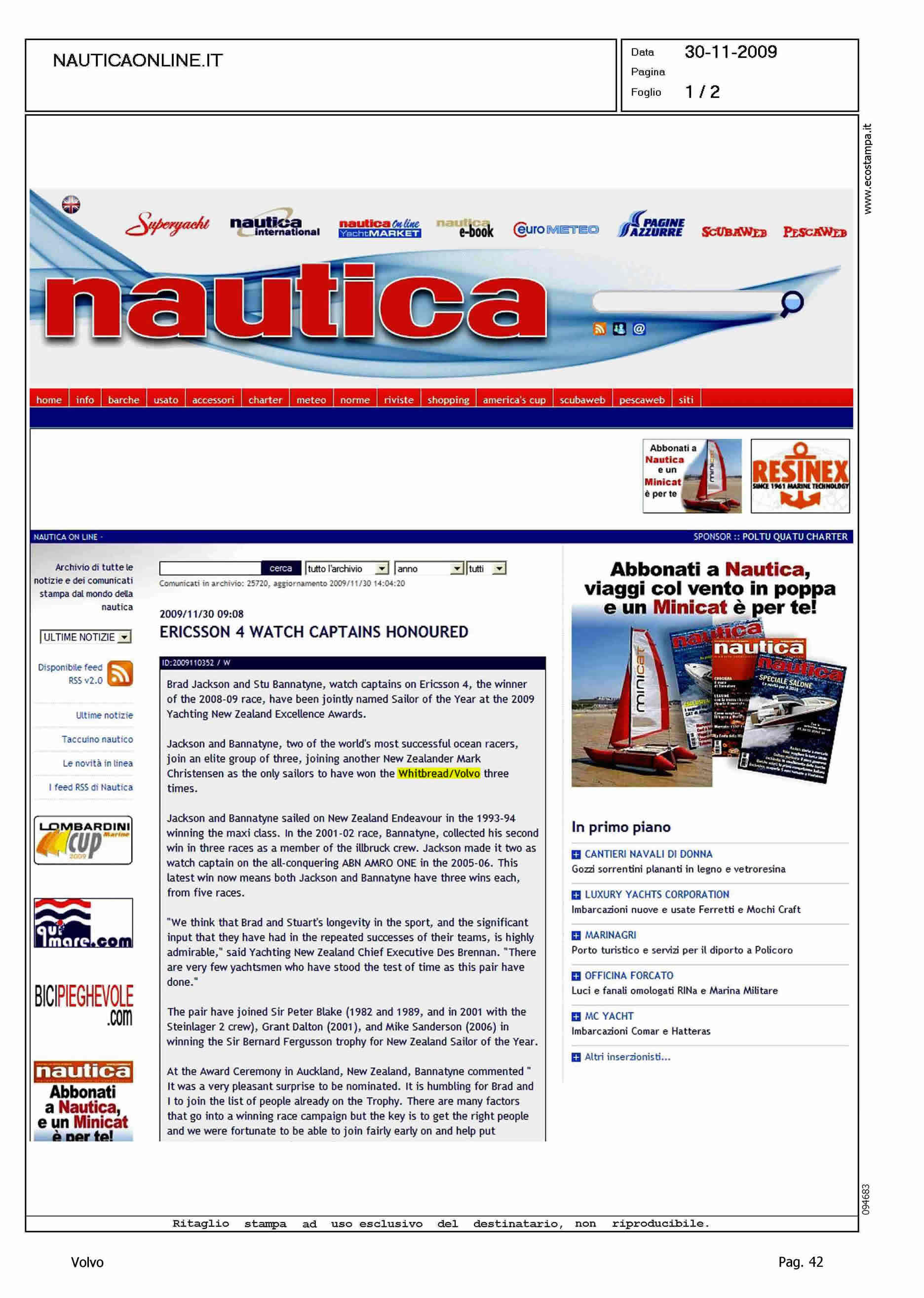 Author: Line: Corporate Model: Corporate Subject: Volvo Ocean Race Title: ERICSSON 4 WATCH CAPTAINS HONOUREDHighlight: COMMENTO ALLA NOTIZIA