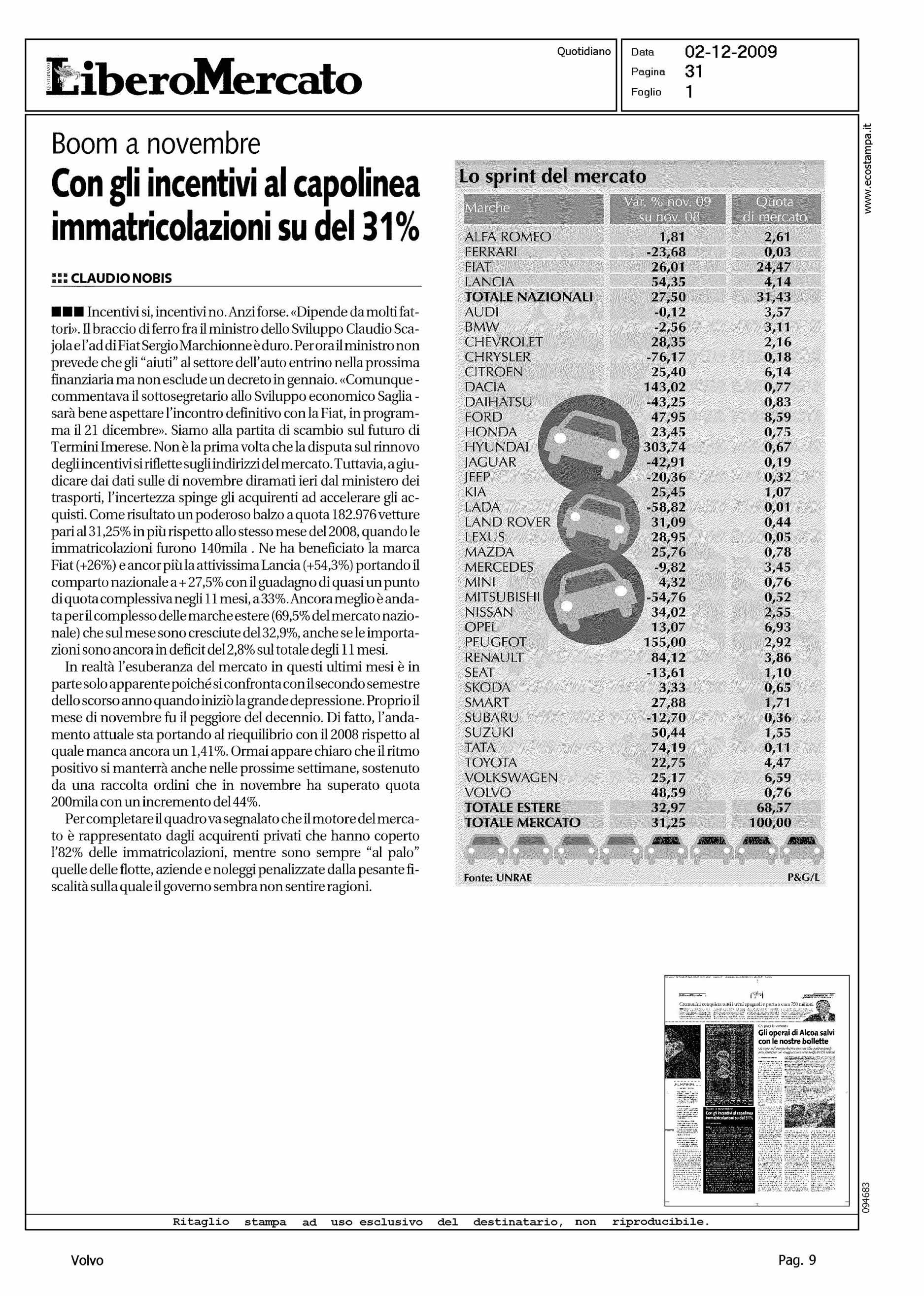 Author: NOBIS, CLAUDIOLine: Corporate Model: Corporate Subject: - Title: CON GLI ECOINCENTIVI AL CAPOLINEA IMMATRICOLAZIONI SU DEL 31%Highlight: COMMENTO ALLA NOTIZIA - IN TABELLA QUOTA VOLVO